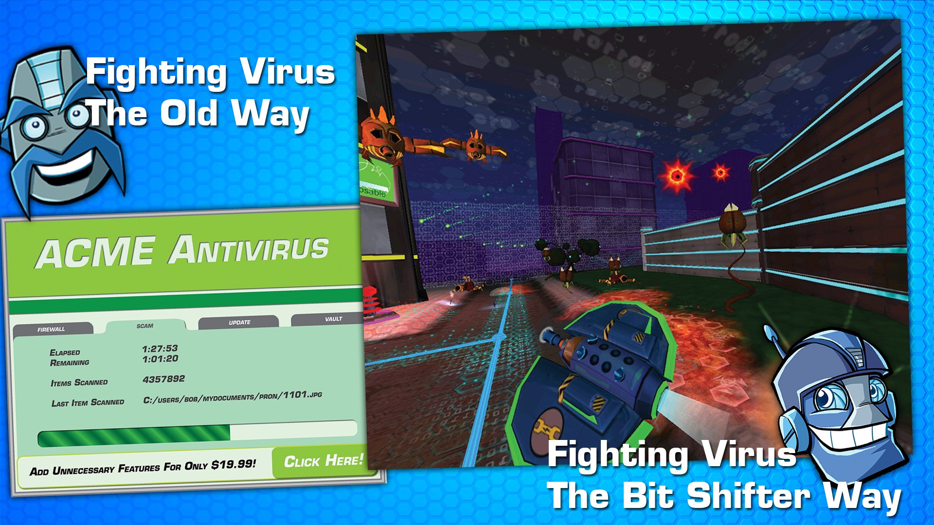 Забудьте про скучные антивирусы вроде «Касперского»! В Bit Shifter вы не просто удаляете вирусы — вы лично влетаете в самое сердце цифрового ада на боевом ховеркорабле Scandisc, чтобы устроить этим байтовым заразам такой разнос, что они будут сниться вашему процессору в кошмарах! Эта 3D-игра жанра action/strategy — это не просто аркадный шутер, а настоящая эпическая война за судьбу вашего «Домашнего Мира», где каждый бит на счету. Представьте себе: вы — последняя надежда цифровой вселенной, вооруженный до зубов и обладающий уникальной способностью не только стрелять, но и командовать целой армией роботизированных солдат.