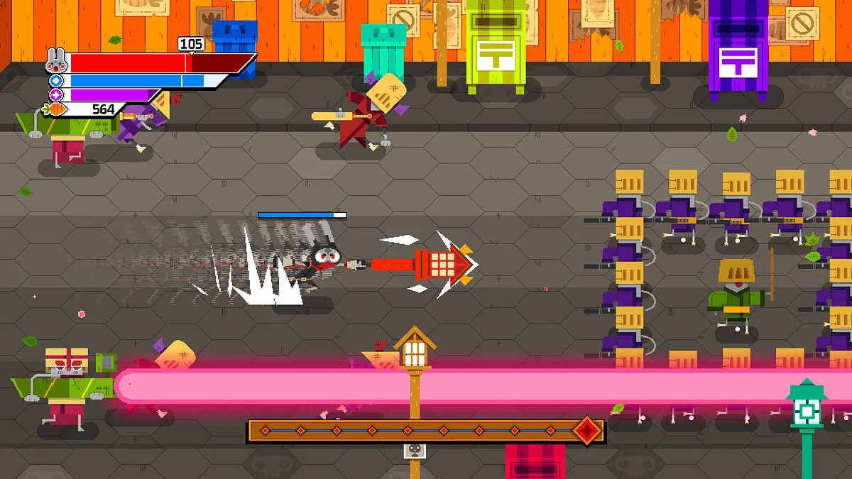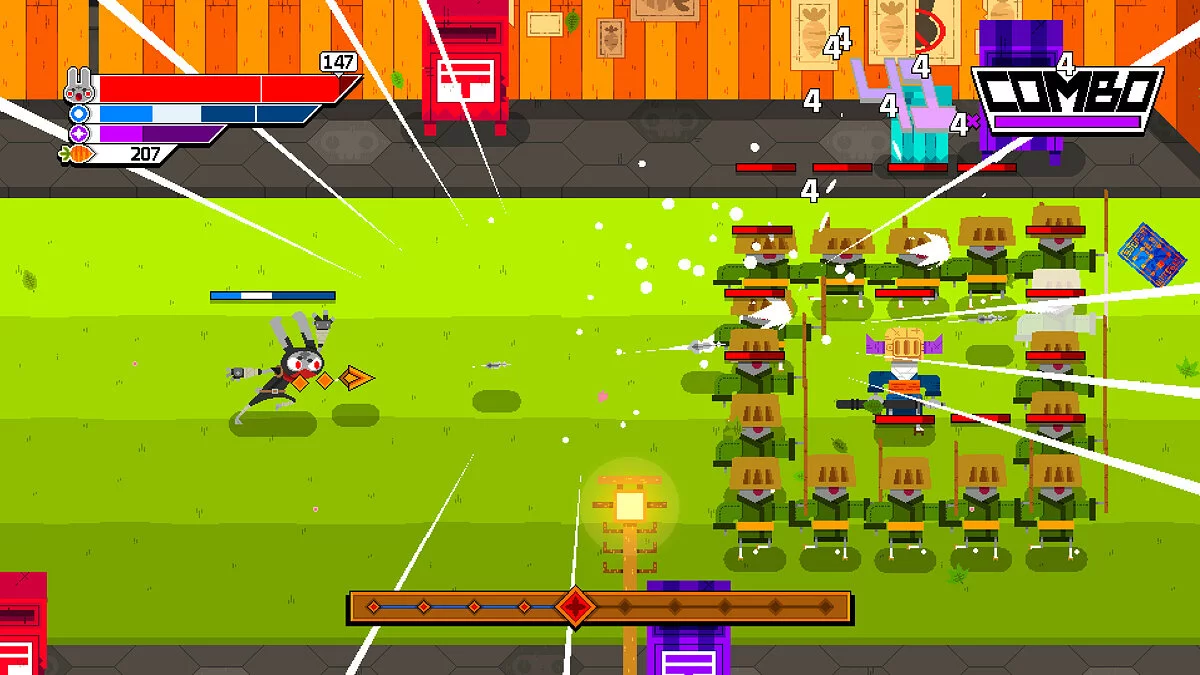 Ninjin: Clash of Carrots — это классический beat 'em up в лучших традициях Castle Crashers и Golden Axe, но с уникальным стилем и кроличьей харизмой. Вас ждут десятки уровней, заполненных до отказа самыми разнообразными врагами: от простых гоблинов и зомби до гигантских роботов и драконов. Геймплей предельно прост и невероятно затягивает: беги, руби, прыгай, используй специальные способности и собирай как можно больше морковок с поверженных противников. А потом — в магазин! Ведь в вашем распоряжении более 150 уникальных предметов: от эпических мечей и луков до совершенно безумных шляп и костюмов, которые не только меняют внешний вид, но и дают полезные бонусы. Это не просто экшен, это настоящая морковная экономика!