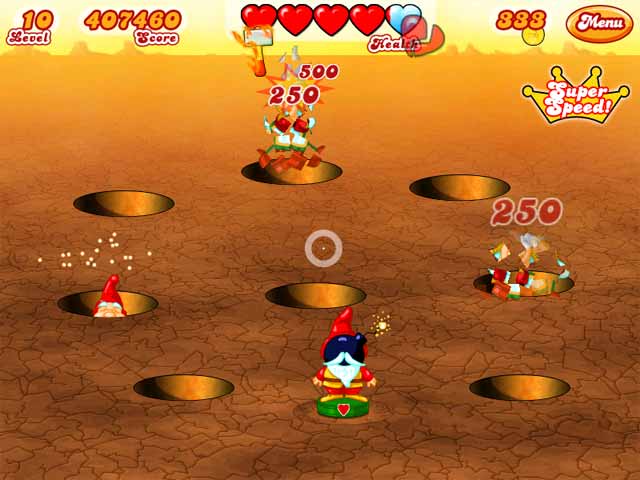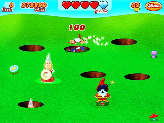 Геймплей Hammer Heads Deluxe — это чистая, незамутненная аркадная экшен-радость, требующая не столько «тыканья мышкой как сумасшедший», сколько точности, стратегии и реакции, достойной ниндзя. Да-да, здесь важно не только бить, но и знать, КОГО бить! Среди обычных гномов-забияк будут появляться особые персонажи: например, золотые гномы принесут вам ценные бонусы, а вот милые щенки или птички — священны! Ударите по ним, и вы потеряете драгоценные очки и здоровье. Представьте, что вы — герой боевика, но вместо пистолета у вас молоток, а вместо террористов — ухмыляющиеся садовые фигурки, мечтающие испортить ваш идеальный газон. Это идеальная casual-игра для тех, кто хочет быстро разрядиться после тяжелого дня или проверить, насколько быстрыми стали их рефлексы.