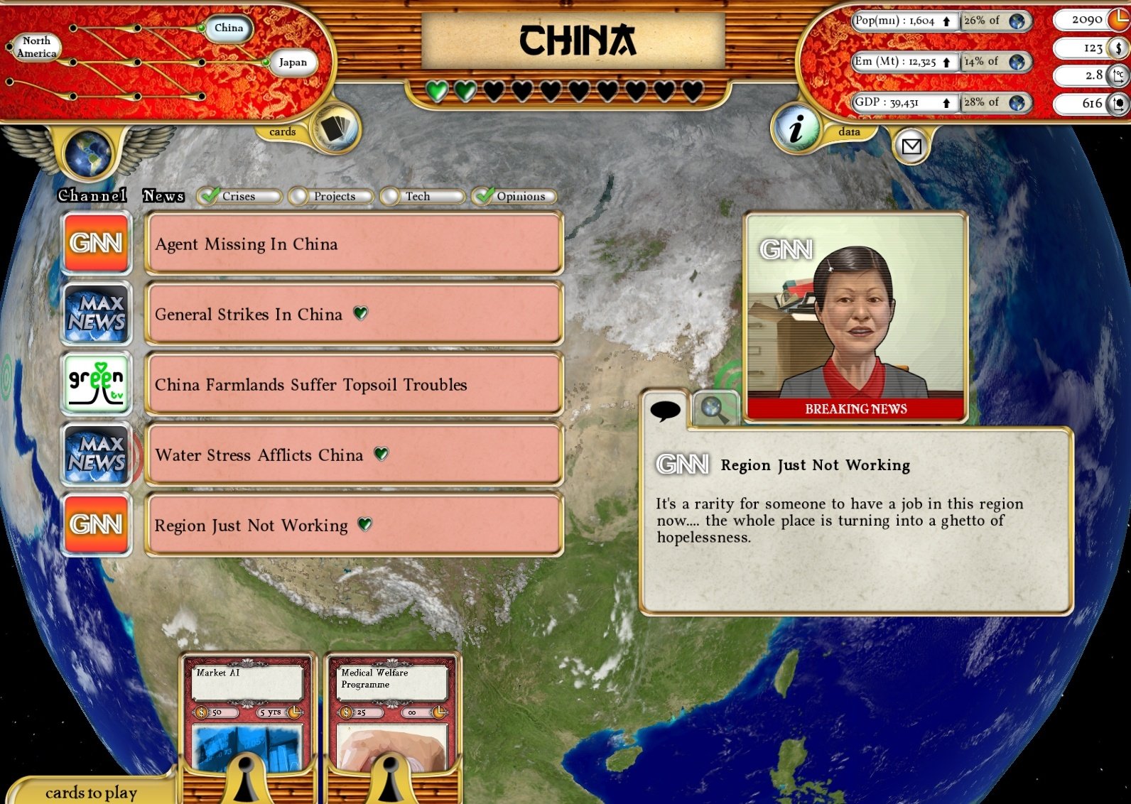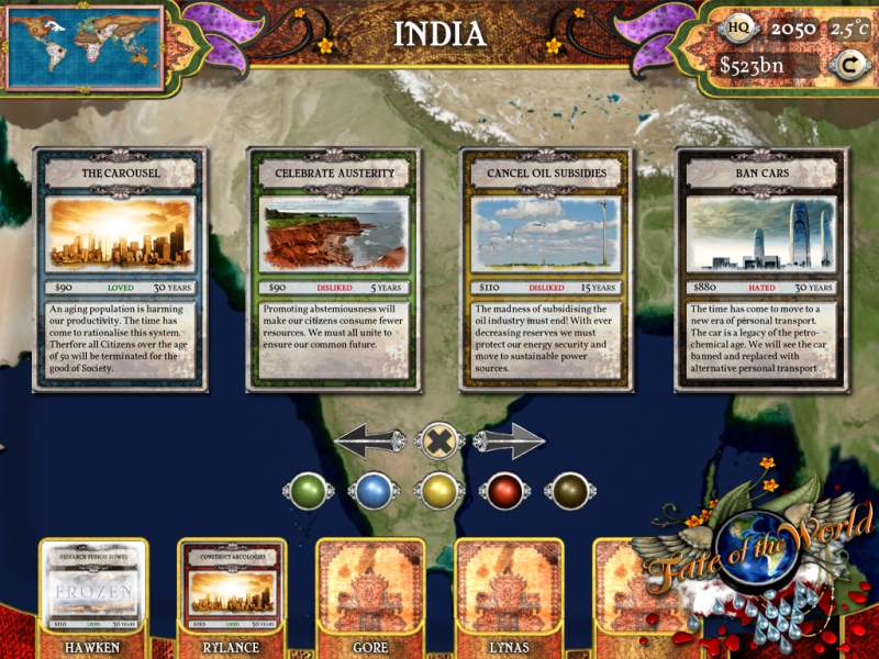 В Fate of the World вы не просто расставляете юниты на карте, а принимаете судьбоносные политические и научные решения, которые влияют на демографию, экономику и экологию всех регионов планеты. Каждый ход в этой пошаговой стратегии — это новый вызов: внедрять ли революционные технологии солнечной энергетики или рискнуть с генной инженерией для увеличения урожайности? Может, лучше запретить автомобили в Европе, пока США настаивают на праве иметь личный вертолёт? Игра мастерски балансирует на грани симулятора и головоломки, где каждый ваш шаг проверяется жёсткой системой целей и последствий. Не справитесь — и вас просто выгонят из GEO, потому что, оказывается, человечество предпочитает комфорт неминуемому апокалипсису. Это не просто игра, это терапия для тех, кто постоянно думает: «А что, если бы я был президентом... хотя бы маленькой страны?».