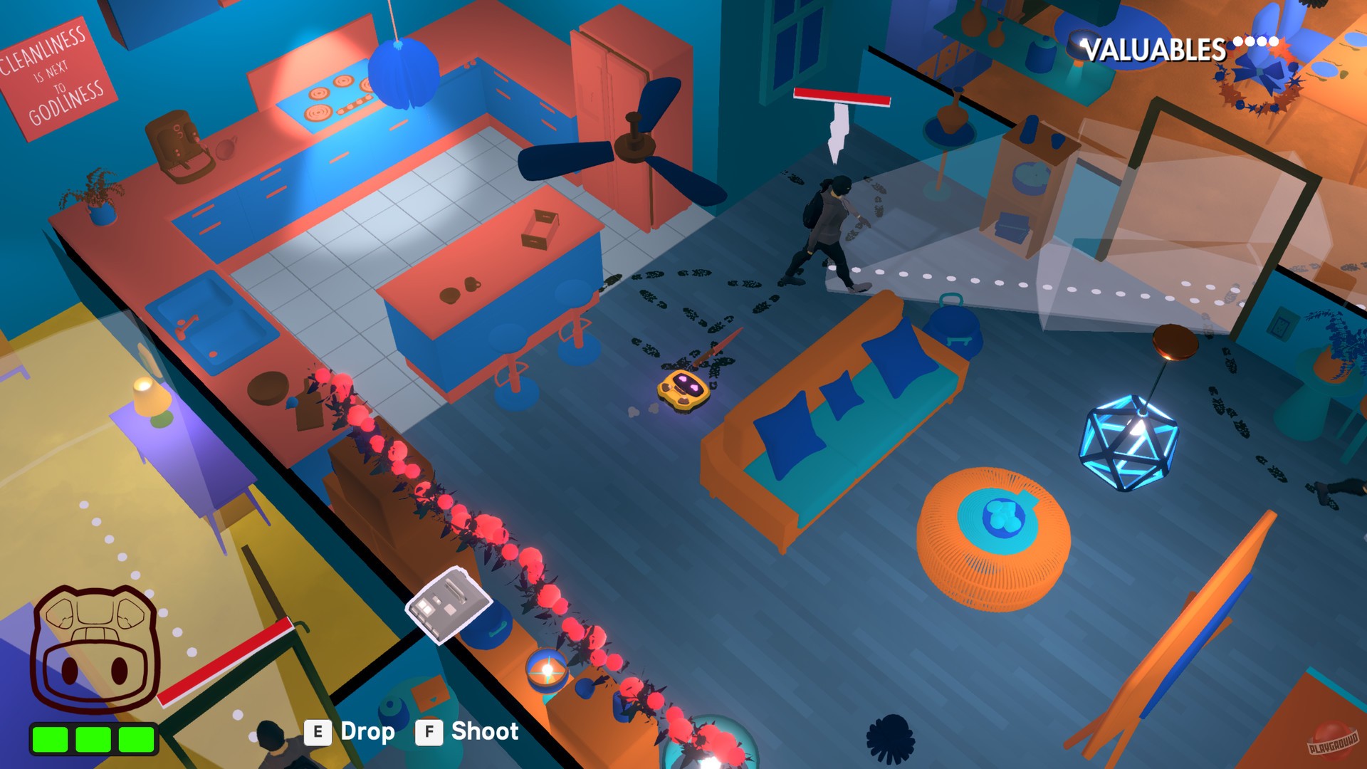 Roombo: First Blood - это юмористический экшен с видом сверху, в котором игрокам отводится роль робота-пылесоса. Его цель - защитить хозяйский дом от вторжения грабителей, используя различные элементы "умного дома", а затем прибраться за собой так, чтобы никто ничего не заподозрил.