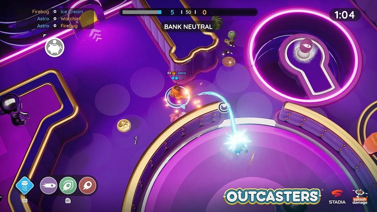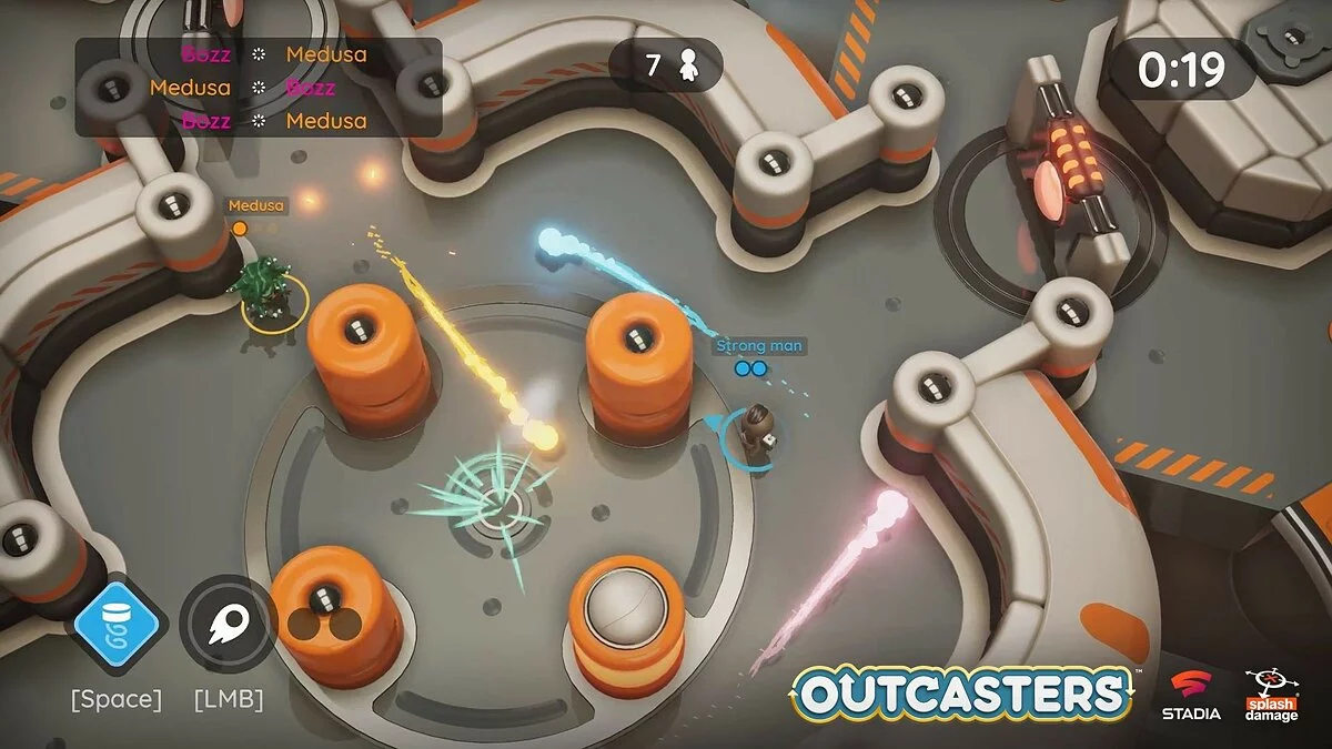 Outcasters — эксклюзивный для Google Stadia аркадный экшен с видом сверху, сделанный разработчиками Dirty Bomb и Gears Tactics. Восемь игроков сражаются друг с другом на арене и используют против противников особое оружие. Оно позволяет задавать траекторию полета снаряда не по прямой, что позволяет побеждать противников, прячущихся за поворотом.