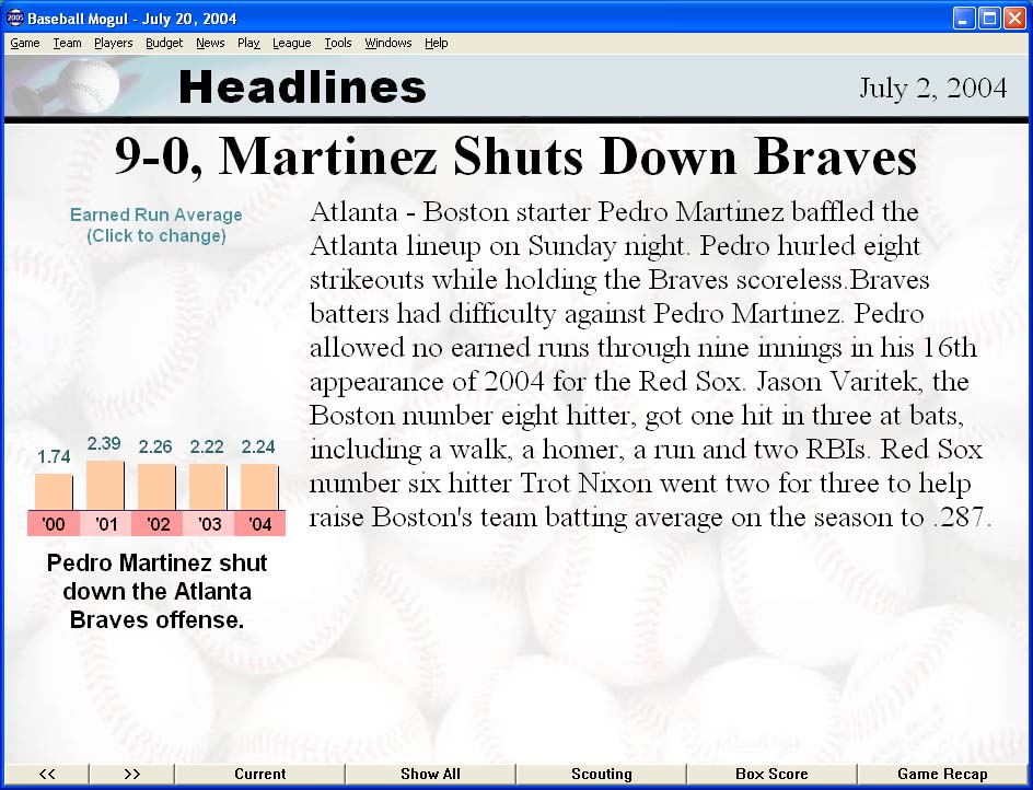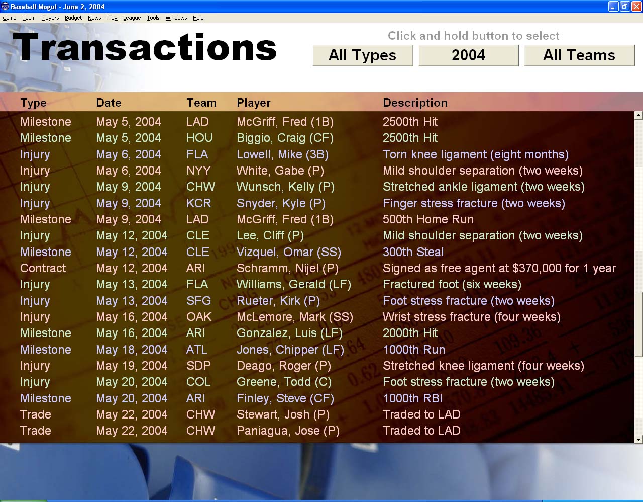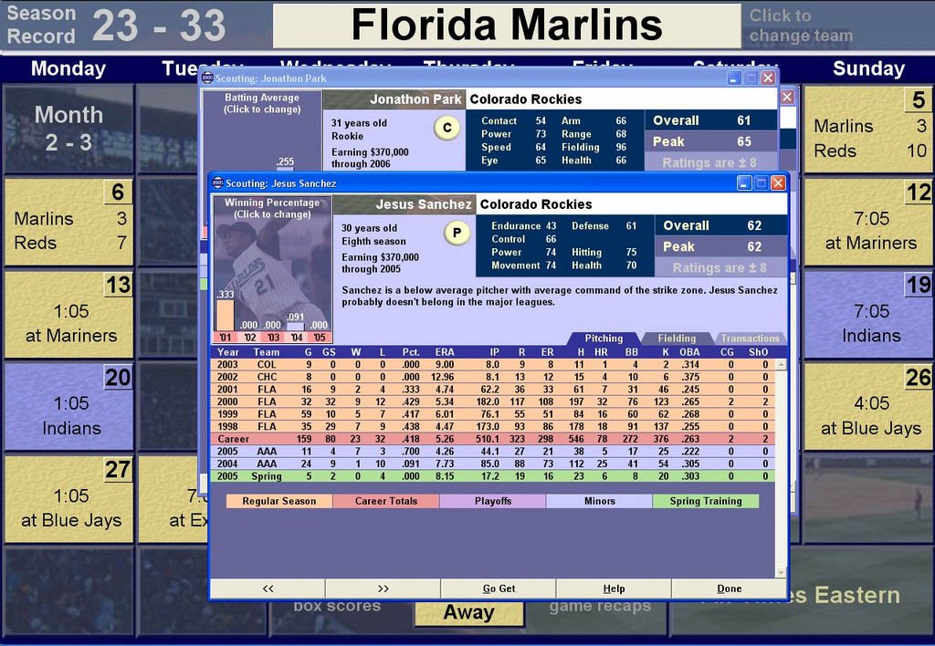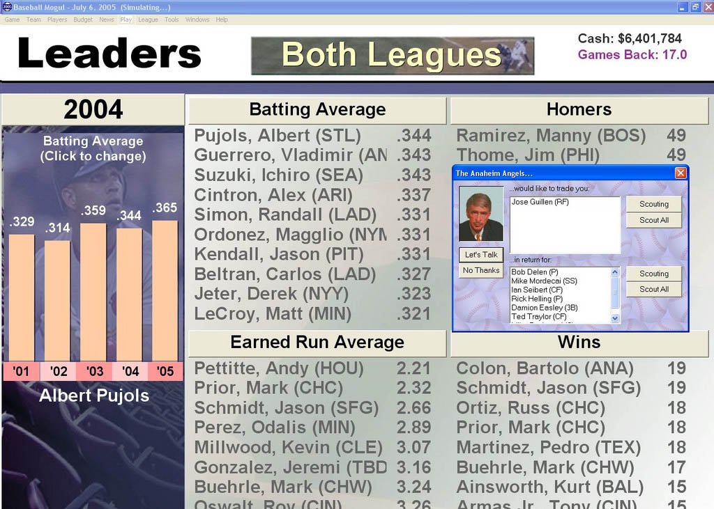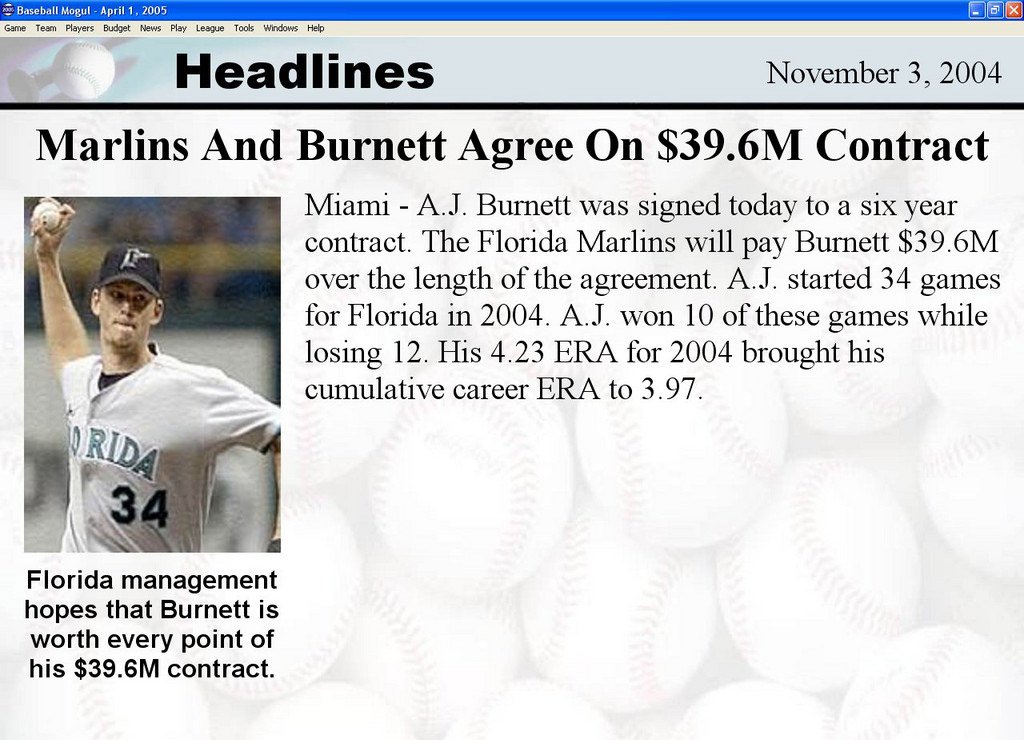 Baseball Mogul 2005 - менеджер бейсбола, который рассчитан на хардкорных игроков. Бейсболисты вашей команды обзавелись характеристиками по стобалльной шкале. Вас ждет множество международных чемпионатов, управление несколькими командами и общение со многими профессиональными спортсменами.
