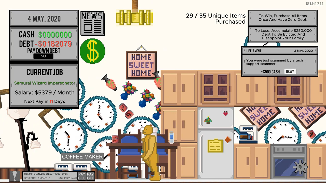 Добро пожаловать в Life and Debt: A Real Life Simulator — ту самую игру, где ваша мечта о свободе от родительского надзора оборачивается кошмаром из квитанций, просроченных счетов и вечного вопроса «куда делись все деньги?!». Забудьте про эпичные сражения с драконами или спасение галактики. Здесь главный босс — это ваша кредитная история, а суперсила — умение уложиться в бюджет на дошираки до получки. Этот 2D-симулятор реальной жизни в пиксельной графике с юмором и жестокой честностью показывает, что значит быть взрослым: вы съезжаете от мамы с папой, получаете свою первую квартиру (точнее, её часть) и тут же попадаете в водоворот финансовых обязательств, где каждое решение может привести либо к скромному процветанию, либо к полному финансовому коллапсу и жизни под мостом (ну, почти).