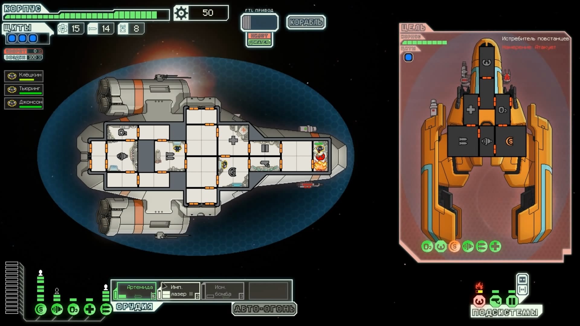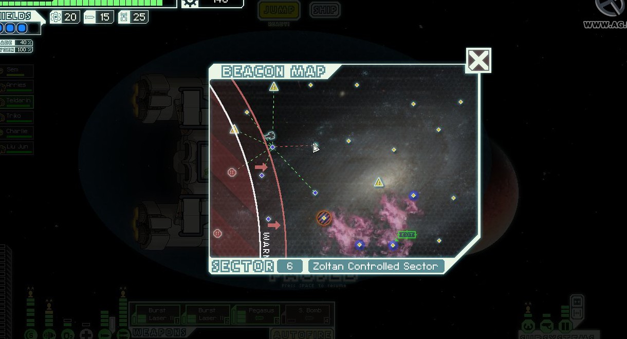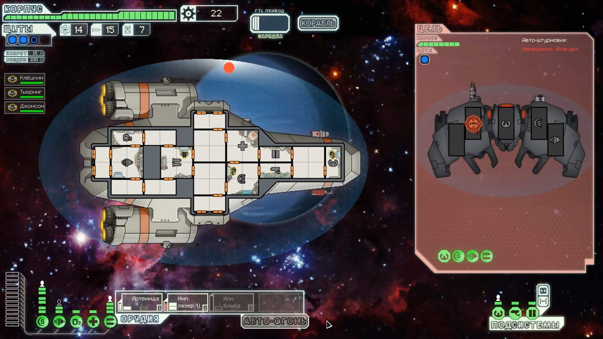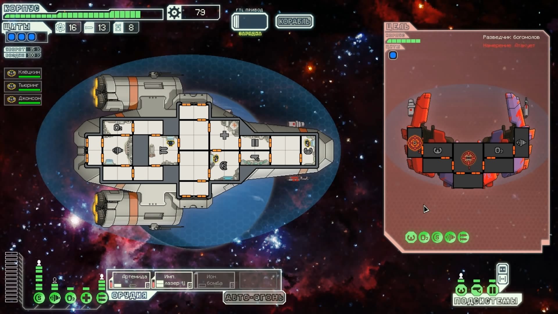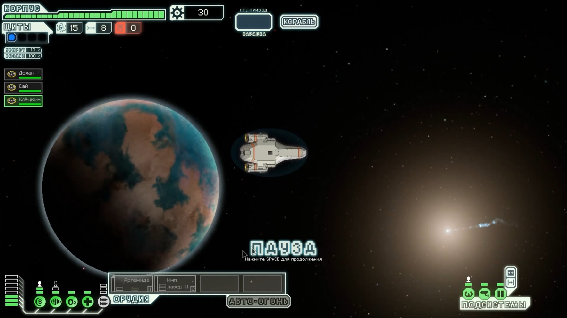 FTL: Faster Than Light – это проект, который сочетает в себе элементы нескольких разных жанров. Здесь есть механики из привычных стратегий, космического симулятора, а также roguelike с массой возможностей. Основная цель игры – поддерживать работоспособность систем жизнеобеспечения космического корабля, позволяя экипажу преодолеть отрезок от стартовой до конечной точки. Процедурно-генерируемые локации создают случайные события, которые оказывают рандомное влияние на атмосферу вашего судна. Помимо прочего, ваш корабль будет постоянно подвергаться атакам представителями агрессивной внеземной расы, захватывающей системы одну за другой. Нанося урон вашему космическому средству передвижения, пришельцы попытаются ликвидировать вас и ваших подопечных, выполняющих важную миссию. Руководство федерации поручило вам провести разведку и установить место нахождения вражеского флагмана, чтобы нанести по нему точечный удар и спасти галактику от неминуемого уничтожения. Потребность в постоянном контроле – из-за повреждений разных отсеков корабля вам постоянно придется перенаправлять энергию и руководить ремонтными работами; Тактические приемы и маневры – останавливайте время, чтобы распределить обязанности между экипажем и продумать свой следующий ход; Разнообразие рас – более 6 уникальных народов со своими оригинальными особенностями ждут, когда вы возьмете их под свой контроль (к примеру, Валуны, Богомолы, Золтаны и так далее); Нелинейность происходящего – выполняйте квесты несколькими разными способами и добивайтесь разных финалов. Если ваш корабль уничтожают, придется начинать весь прогресс сначала. Перманентной является также гибель членов экипажа – в таком случае нужно будет нанимать новых бойцов, учитывая их сильные и слабые стороны. Каждое новое прохождение будет уникальным, так как условия, миры и параметры персонажей формируются случайным образом. Зарабатывая очки, открывайте новые типы кораблей, модули и специалистов, чтобы в этот раз дать агрессорам достойный отпор.