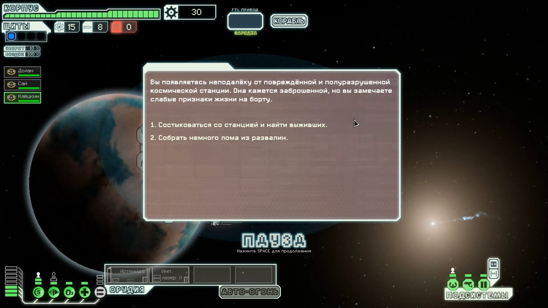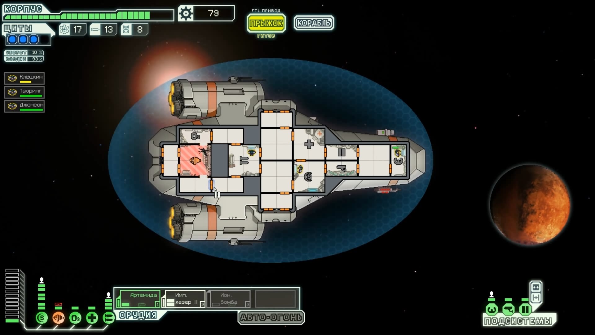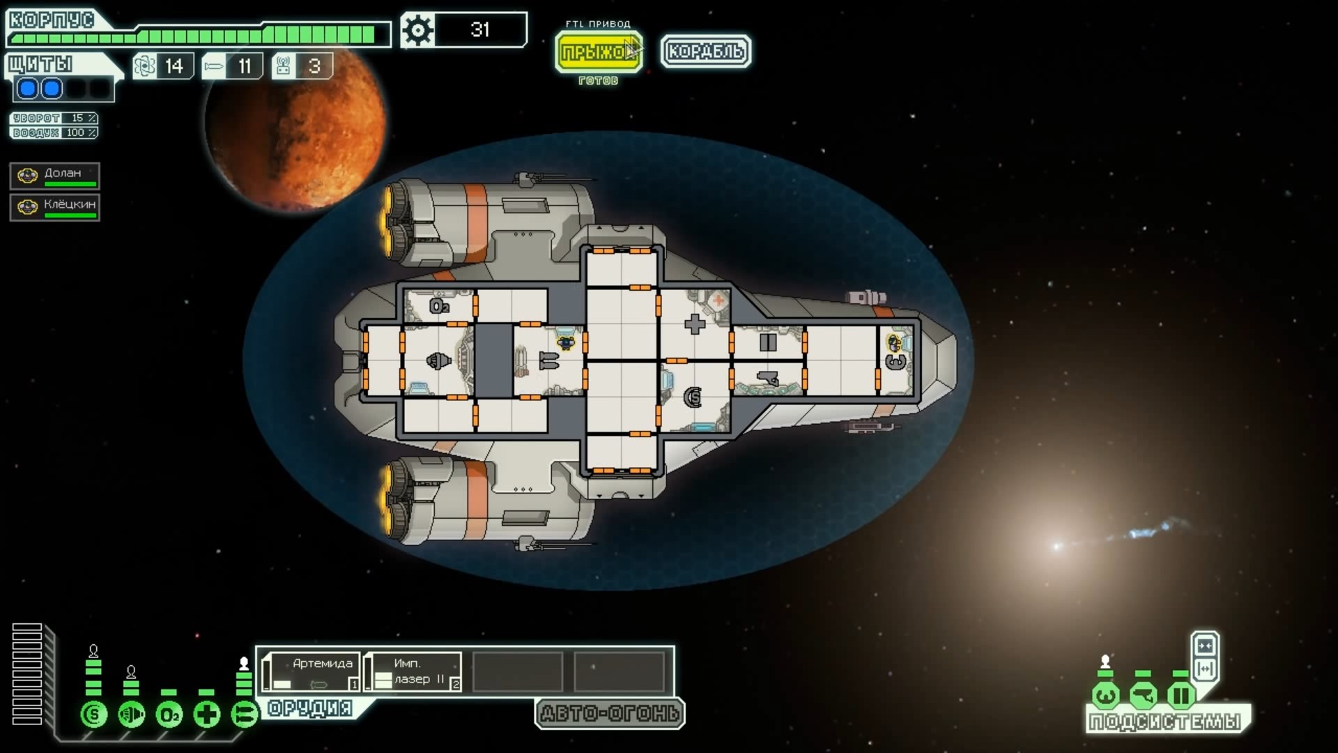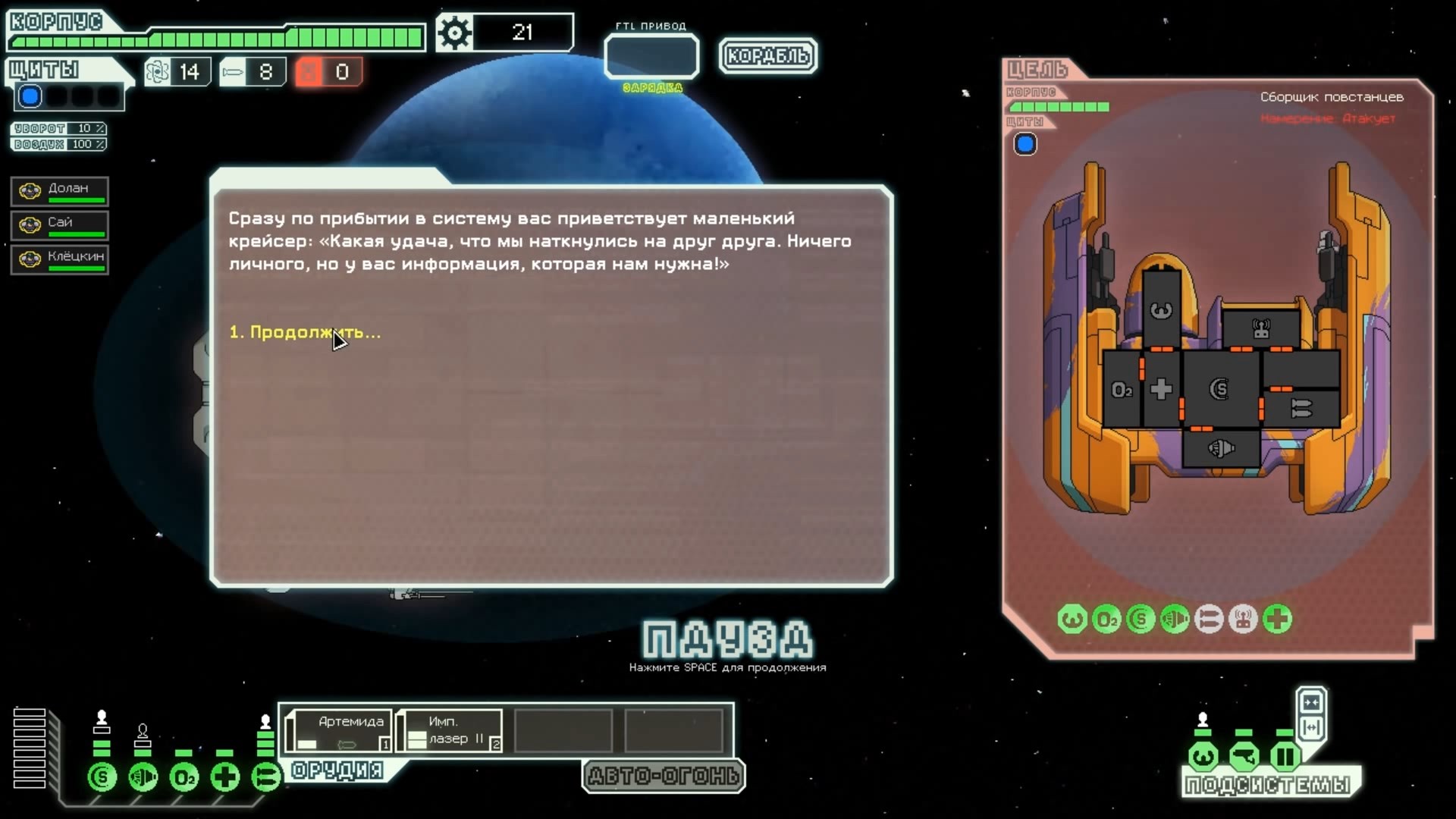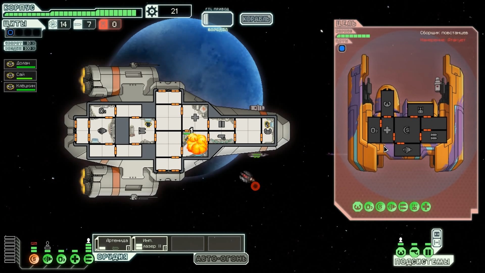 FTL: Faster Than Light – это проект, который сочетает в себе элементы нескольких разных жанров. Здесь есть механики из привычных стратегий, космического симулятора, а также roguelike с массой возможностей. Основная цель игры – поддерживать работоспособность систем жизнеобеспечения космического корабля, позволяя экипажу преодолеть отрезок от стартовой до конечной точки. Процедурно-генерируемые локации создают случайные события, которые оказывают рандомное влияние на атмосферу вашего судна. Помимо прочего, ваш корабль будет постоянно подвергаться атакам представителями агрессивной внеземной расы, захватывающей системы одну за другой. Нанося урон вашему космическому средству передвижения, пришельцы попытаются ликвидировать вас и ваших подопечных, выполняющих важную миссию. Руководство федерации поручило вам провести разведку и установить место нахождения вражеского флагмана, чтобы нанести по нему точечный удар и спасти галактику от неминуемого уничтожения. Потребность в постоянном контроле – из-за повреждений разных отсеков корабля вам постоянно придется перенаправлять энергию и руководить ремонтными работами; Тактические приемы и маневры – останавливайте время, чтобы распределить обязанности между экипажем и продумать свой следующий ход; Разнообразие рас – более 6 уникальных народов со своими оригинальными особенностями ждут, когда вы возьмете их под свой контроль (к примеру, Валуны, Богомолы, Золтаны и так далее); Нелинейность происходящего – выполняйте квесты несколькими разными способами и добивайтесь разных финалов. Если ваш корабль уничтожают, придется начинать весь прогресс сначала. Перманентной является также гибель членов экипажа – в таком случае нужно будет нанимать новых бойцов, учитывая их сильные и слабые стороны. Каждое новое прохождение будет уникальным, так как условия, миры и параметры персонажей формируются случайным образом. Зарабатывая очки, открывайте новые типы кораблей, модули и специалистов, чтобы в этот раз дать агрессорам достойный отпор.