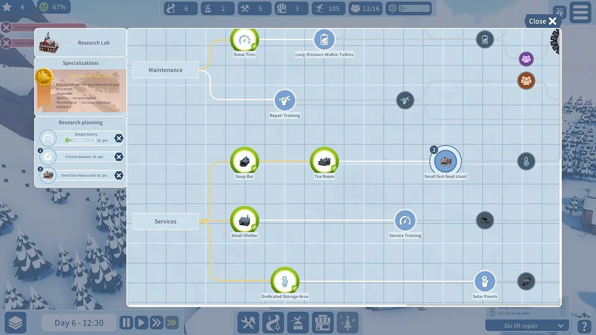 В Snowtopia: Ski Resort Tycoon вы получаете девственную, нетронутую гору и полную свободу действий (и разрушений). Ваша миссия — превратить этот заснеженный пустырь в мекку для лыжников и сноубордистов со всего мира. Стройте отели, чтобы гости не ночевали в сугробах, прокладывайте лыжные трассы всех уровней сложности — от "маминой прогулки" до "черной дыры для экстремалов", и, конечно же, устанавливайте целую армию подъёмников и фуникулеров, ведь никто не хочет карабкаться на гору пешком после того, как съехал с неё на животе. Управляйте персоналом, следите за настроением гостей и их кошельками, обеспечивайте инфраструктуру кафе и магазинами сувениров. Всё это — классический геймплей жанра tycoon, но подан в удивительно расслабленной и даже медитативной манере. Это не "RollerCoaster Tycoon", где всё летит к чертям, а скорее его спокойный, любящий свежий воздух двоюродный брат.
