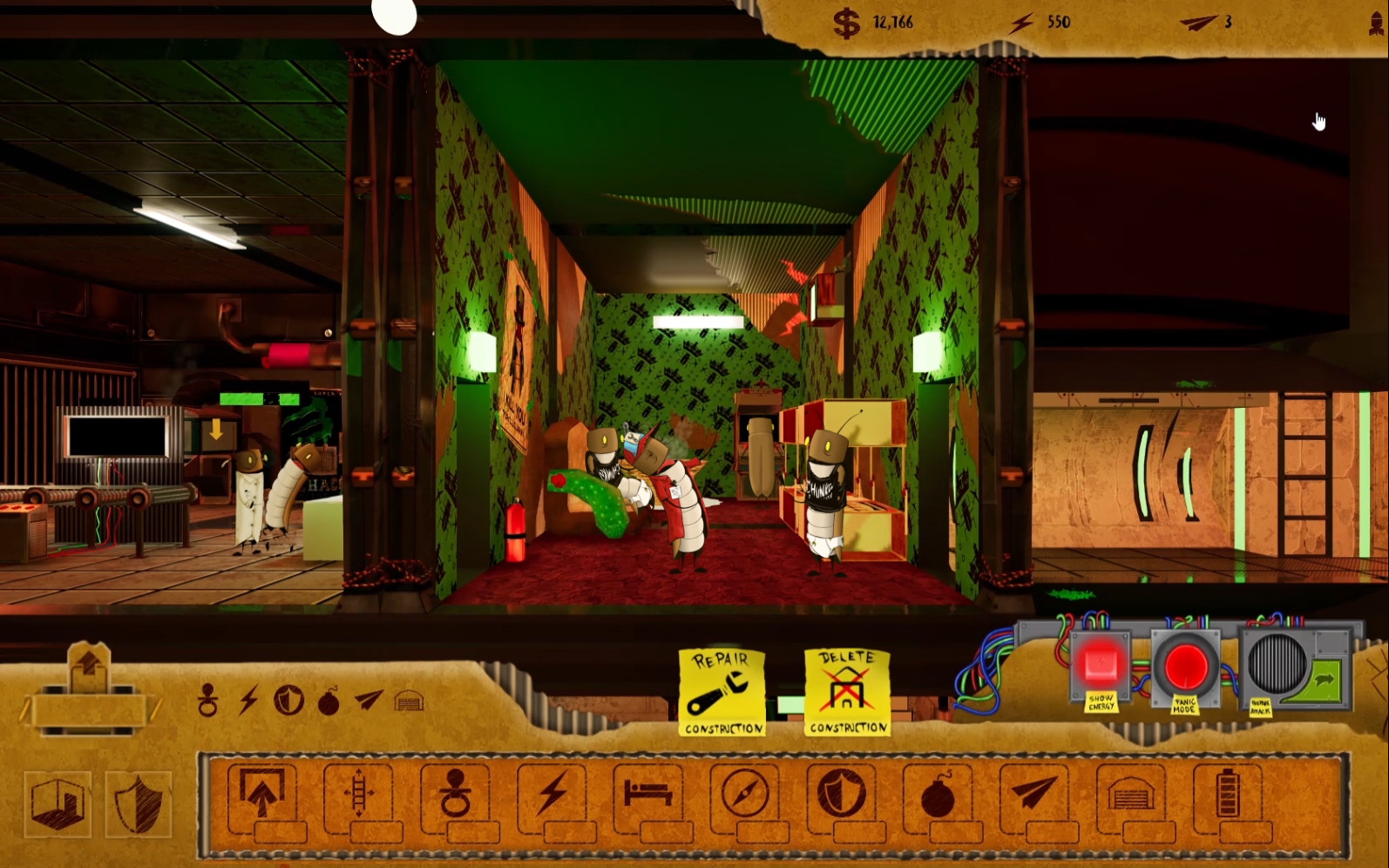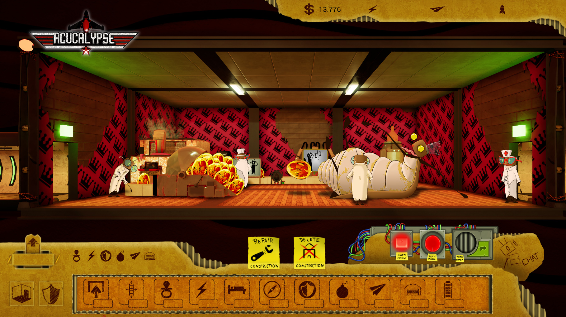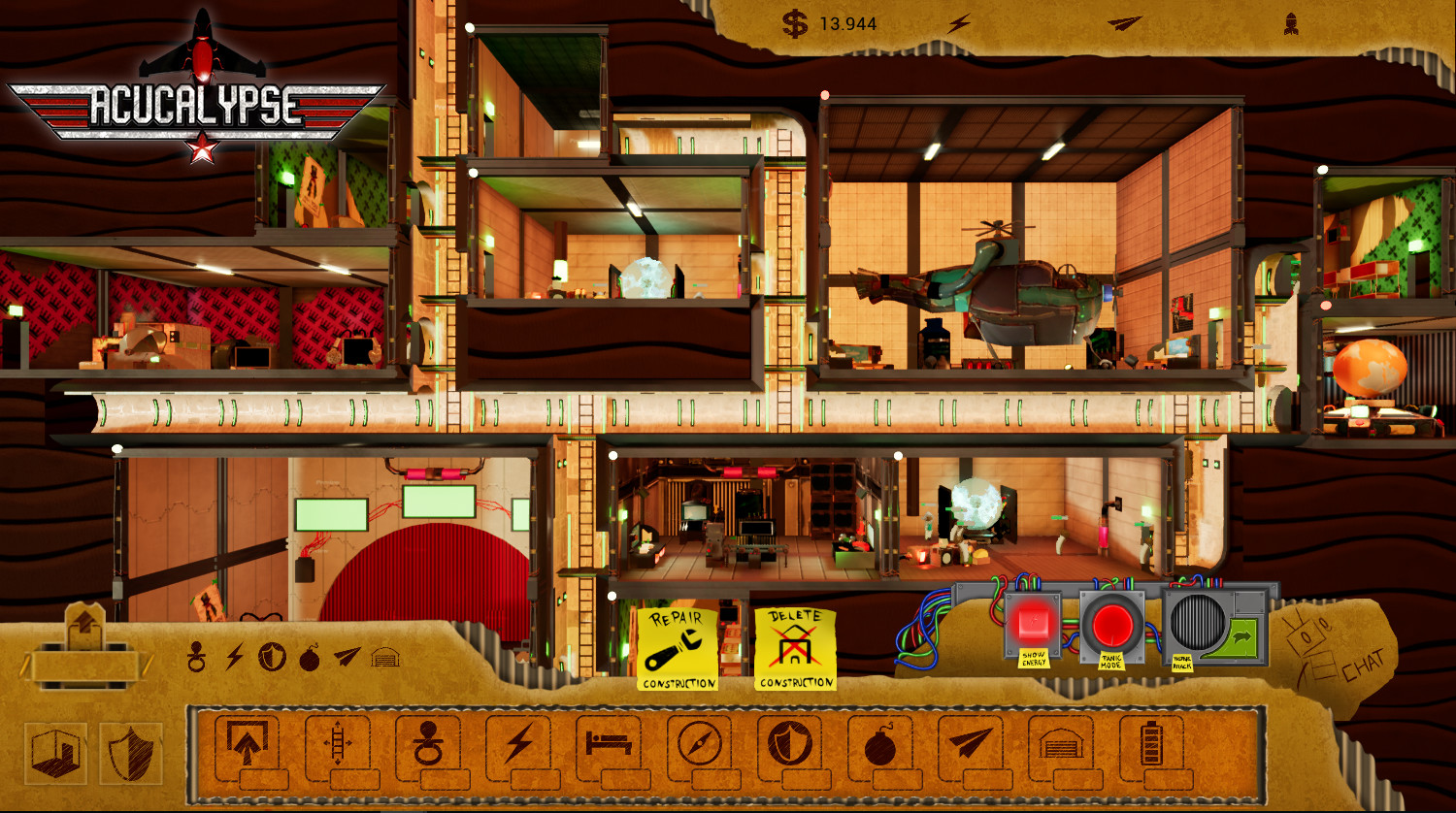 Геймплей Acucalypse — это идеальный микс из спокойного менеджмента и безумной разрушительной аркады. Сначала вы тщательно проектируете свой бункер: расставляете генераторы, склады с едой и даже комнаты для отдыха (ведь даже в апокалипсисе хочется комфорта). Но как только вы выходите в онлайн-режим или сталкиваетесь с ИИ-противником, начинается самое интересное. Ваша задача — рассчитать траекторию полета своей ракеты так, чтобы она не просто долетела до цели, а угодила прямо в реактор вражеского убежища, устроив там фейерверк из взрывов и паники. Это напоминает классические игры вроде Worms, но с гораздо более серьезным подходом к строительству и тактике.