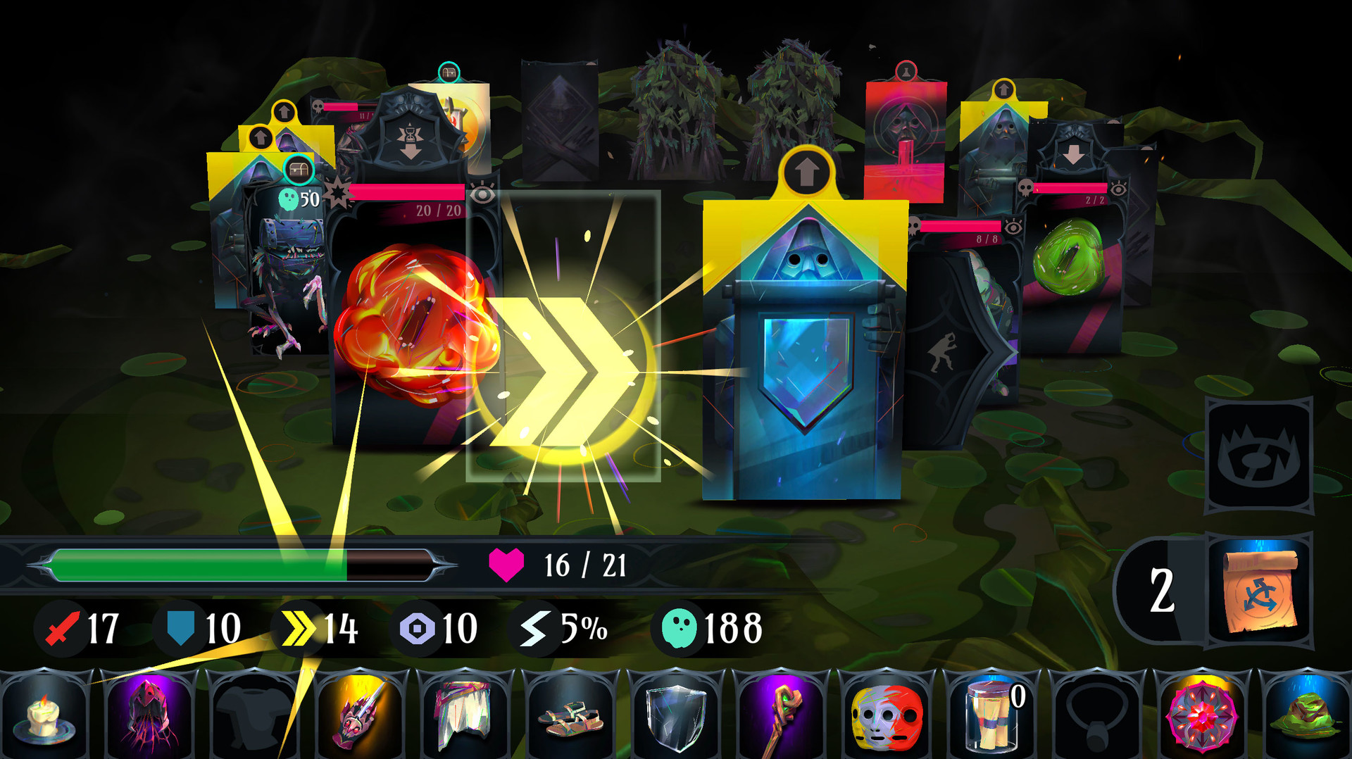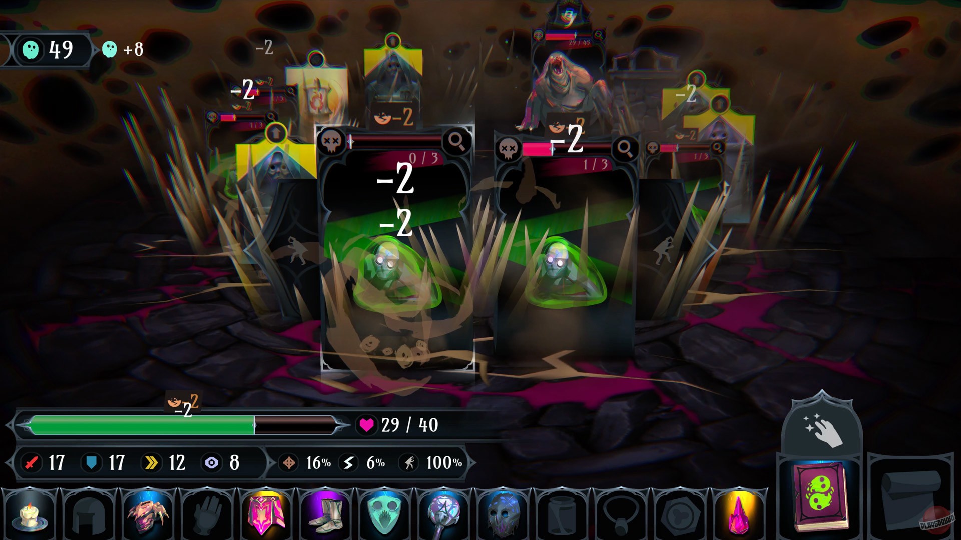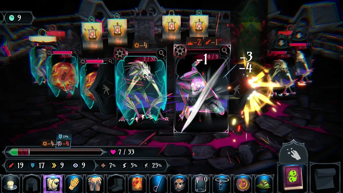 Сердце Ring of Pain — это её карточная система и управление инвентарём. По мере прохождения вы будете собирать разнообразные предметы и экипировку, которая кардинально меняет вашу тактику. Хотите стать непробиваемым танком? Или, может, предпочитаете стиль "нанеси урон и исчезни"? А может, вы тот самый хитрый игрок, который собирает коллекцию милых, но смертоносных питомцев? Возможности безграничны, а рандомизированные награды после каждого боя гарантируют, что ни одна попытка не будет похожа на предыдущую. Игра щедро вознаграждает тех, кто умеет просчитывать риски и принимать взвешенные решения, превращая каждый забег в уникальную историю о борьбе со страхами и темными углами вашего инвентаря.