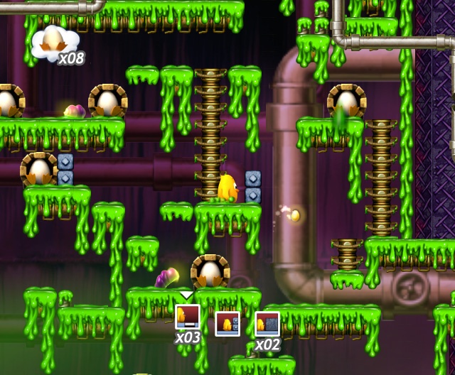 Toki Tori — это не просто платформер, а настоящая головоломка в яркой обёртке. Игровой процесс заставит вас хорошенько поломать голову, ведь каждое движение нужно просчитывать заранее. Цыплёнок — не ниндзя, он не может просто так пробежать мимо врагов или запрыгнуть на высокую платформу. Вместо этого вы получаете доступ к уникальному набору инструментов: замораживающий луч, чтобы превратить опасных тварей в безобидные ледышки; телепортационное устройство для мгновенных перемещений; строительные комплекты для возведения мостиков и лестниц прямо на ходу. Каждый новый мир — будь то таинственный лес, мрачный замок, вонючая канализация или футуристическая лаборатория — открывает новые возможности и усложняет задачу, превращая игру в увлекательный квест по решению всё более изощрённых головоломок.