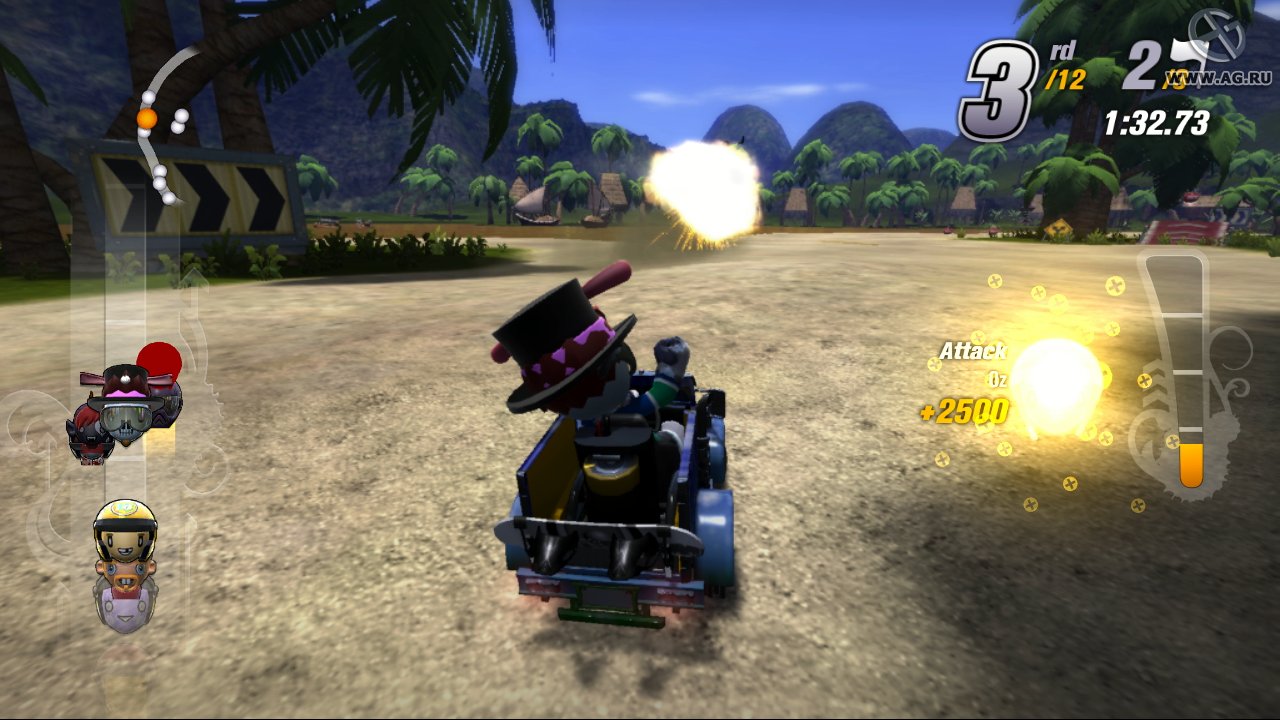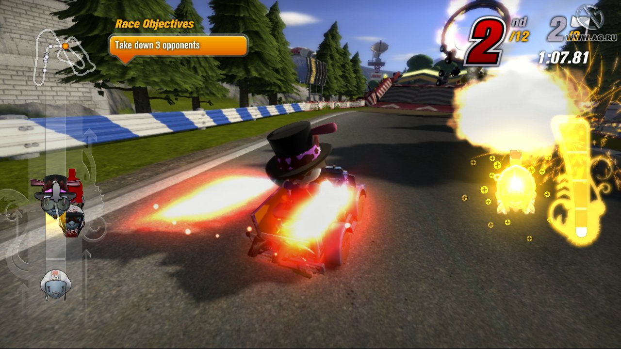 Конечно, без баталии не обходится. Гонки в ModNation Racers — это сплошной адский квест, где каждый поворот может стать последним. У вас в арсенале целый зоопарк оружия и гадостей: от классических ракет и мин до более экзотических штук вроде щитов, которые превращают вас в непробиваемого танк, или даже способности временно превратить соперника в безобидного кролика. Мультиплеер (как локальный, так и онлайн) — это отдельный уровень веселья, особенно когда вы гоняетесь с друзьями, вооружённые до зубов и с болидами, собранными из подручных материалов. Атмосфера игры невероятно яркая, красочная и дружелюбная, она буквально кричит: "Не бойся экспериментировать!". Так что если вы устали от реалистичных симуляторов и хотите вдохнуть свежий воздух творчества и безумия, ModNation Racers — ваш билет в мир, где правила пишете вы сами.