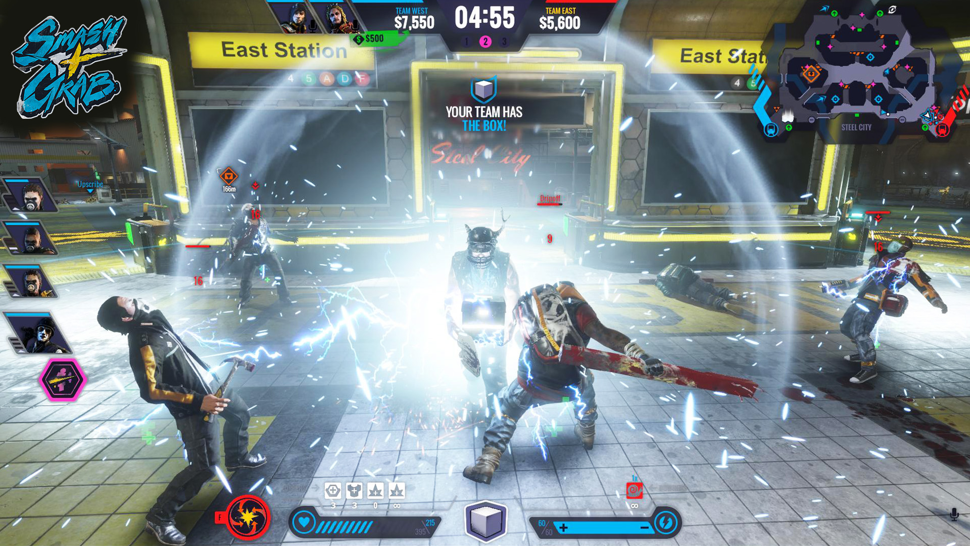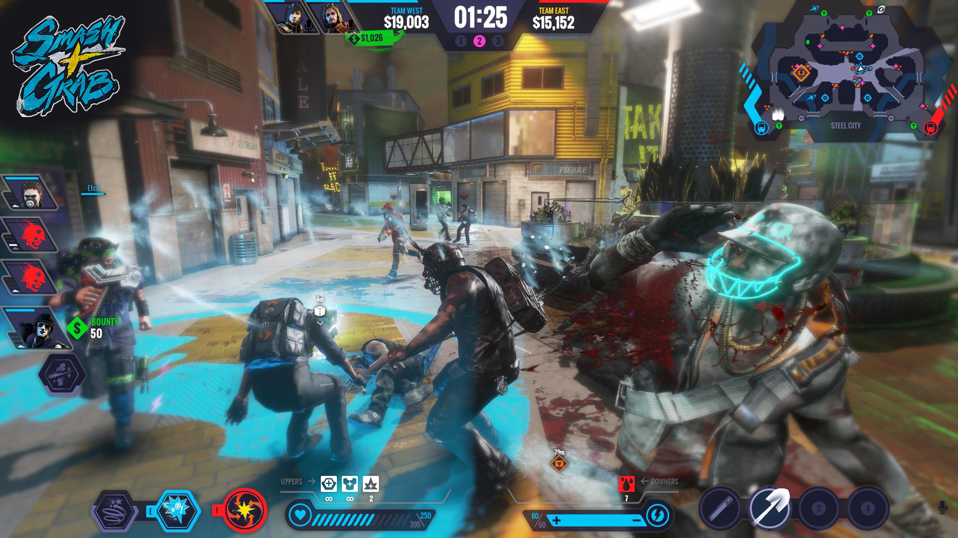 В Smash + Grab вы не одинокий волк, а часть хорошо отлаженной (ну, или хотя бы старающейся быть таковой) банды из трех игроков. Ваша миссия, если вы решите ее принять (а вы примете, ведь отказаться от хаоса невозможно!), — прорваться через вражеские порядки, захватить ценные контейнеры с добычей и доставить их на свою базу. Звучит просто? Ха! Пока вы тащите свой трофей, противник делает то же самое, а еще между вами летают пули, взрываются гранаты и все вокруг напоминает финальную битву из «Матрицы», если бы ее снимали в мире «Бегущего по лезвию». Геймплей сочетает в себе элементы MOBA и классического шутера, требуя от вас не только меткости, но и стратегического мышления. Кто будет прикрывать, кто — нести лут, а кто — отвлекать врага, устраивая фейерверк из гранат? Решать вам и вашей команде!