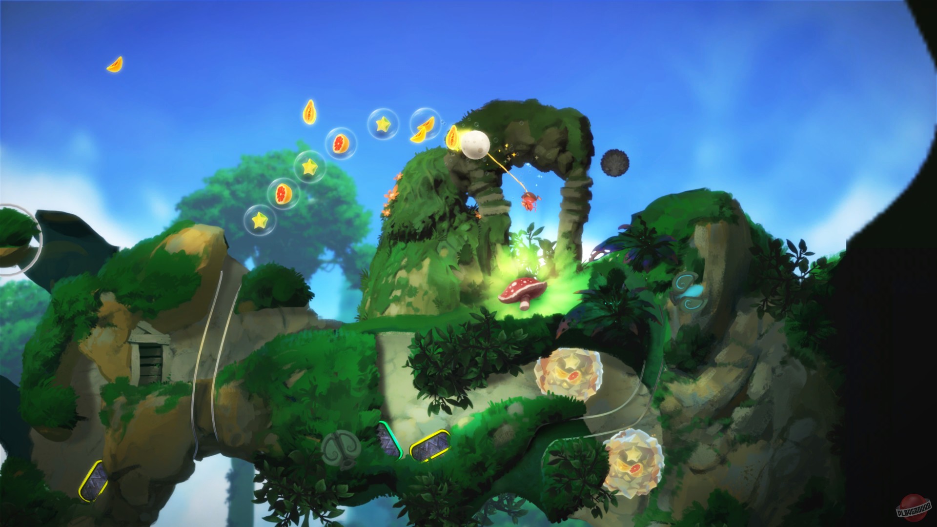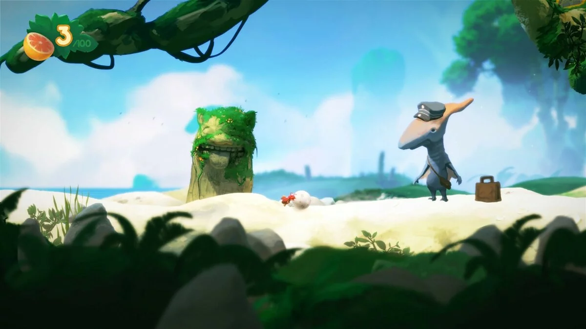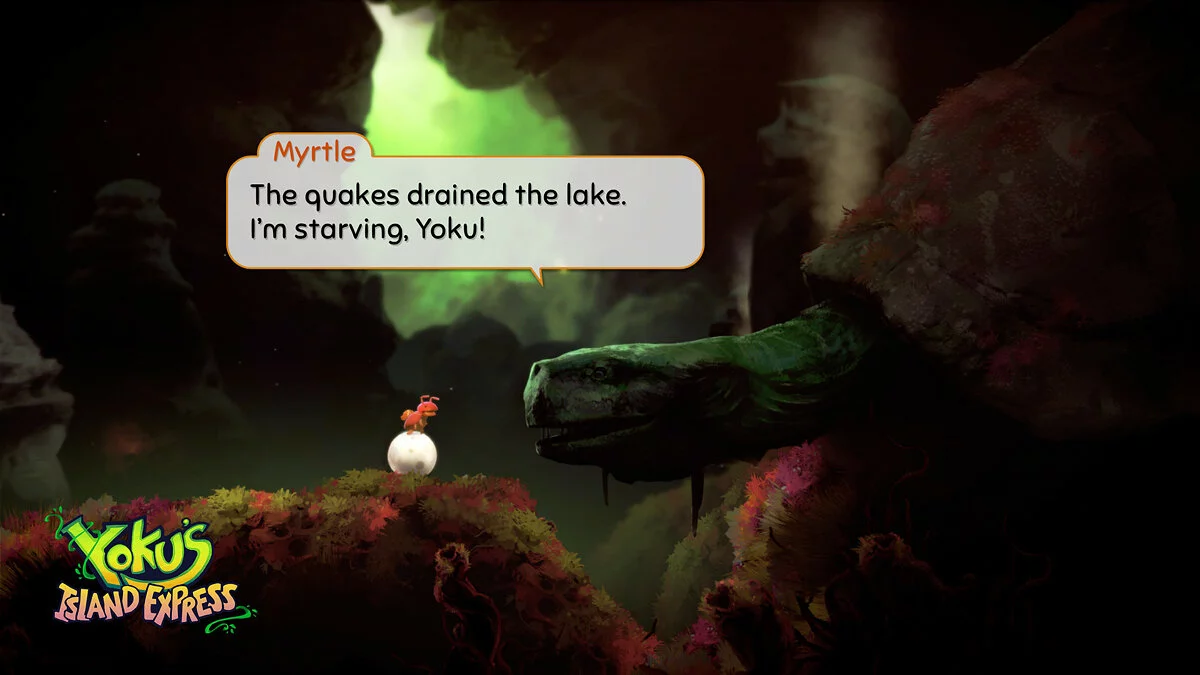 Геймплей Yoku's Island Express — это чистая магия. Вы не прыгаете и не бегаете в привычном понимании. Вместо этого вы катитесь, подпрыгиваете от резиновых бамперов, летите по воздушным потокам и запускаетесь из пушек, словно мячик в вашей любимой аркаде 90-х. Каждая локация острова — это продуманная секция пинбол-машины, соединенная с другими тоннелями и секретными проходами. Исследование мира здесь — ключ к успеху. Вам нужно будет открывать новые способности (вроде подводного дыхания или возможности катить за собой тяжелые предметы), чтобы добраться до ранее недоступных областей, что является классикой для жанра метроидвании. При этом игра невероятно дружелюбна к игроку: она нелинейна, так что вы можете выбирать, какой квест выполнять следующим, и практически не наказывает за «смерти» — Йоку просто возвращается к последнему флагу, готовый снова отправиться в путь.