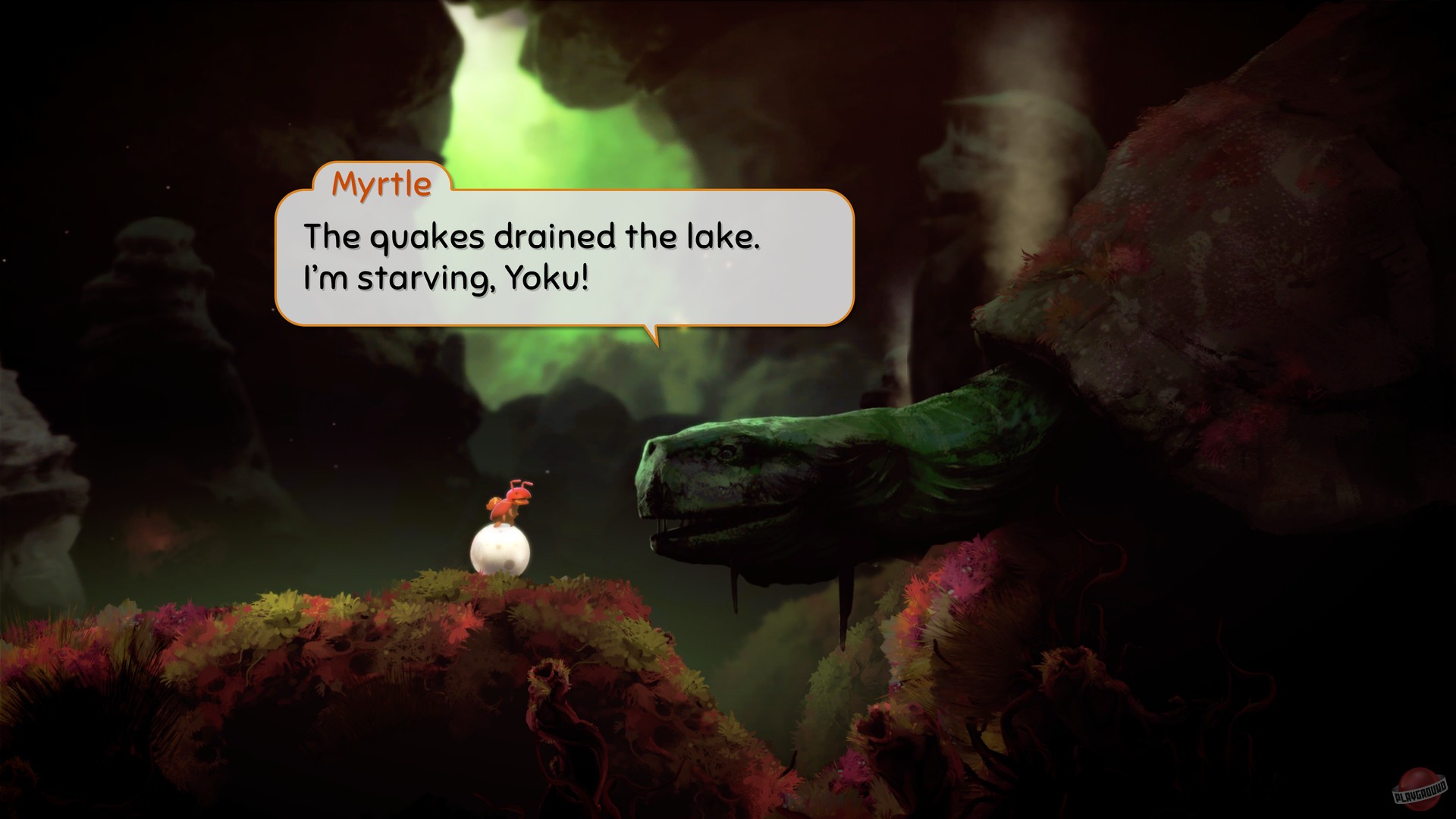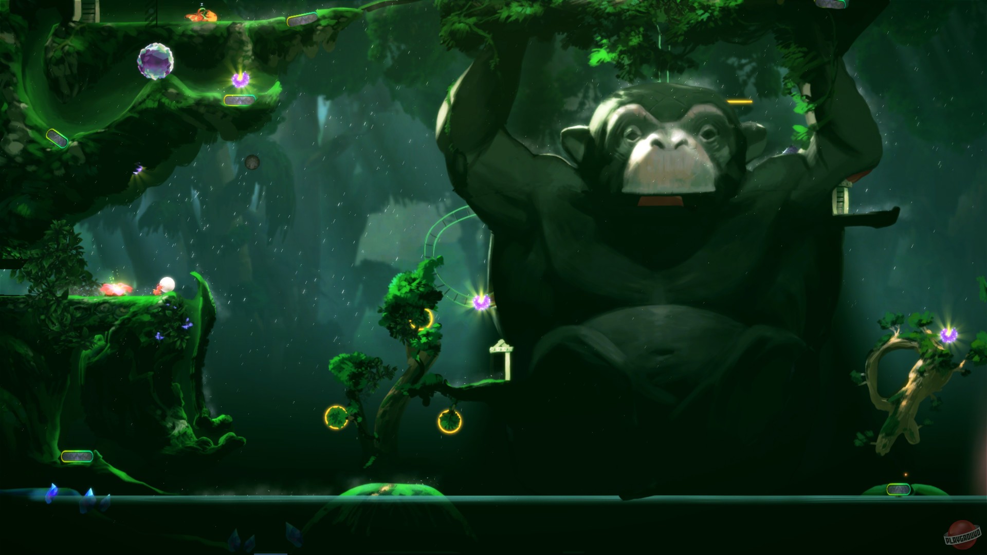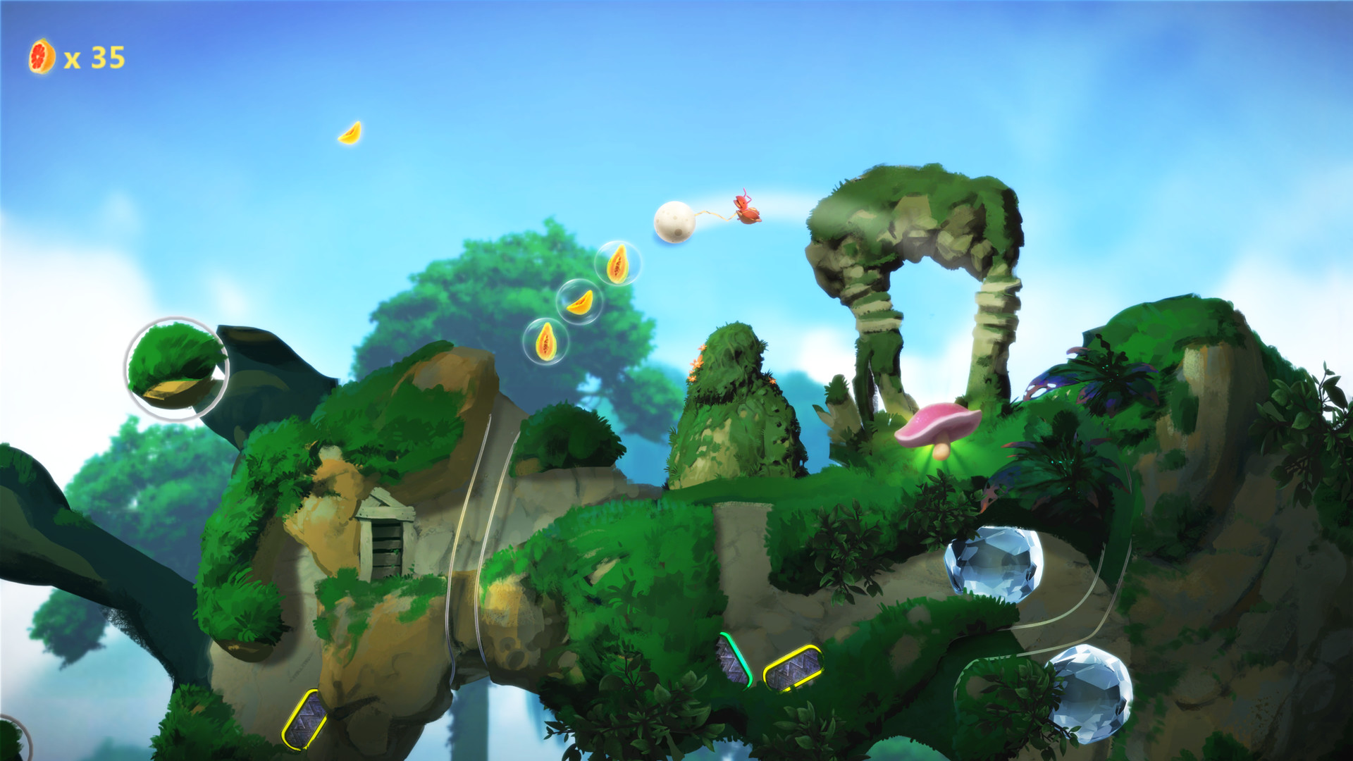 Геймплей Yoku's Island Express — это чистая магия. Вы не прыгаете и не бегаете в привычном понимании. Вместо этого вы катитесь, подпрыгиваете от резиновых бамперов, летите по воздушным потокам и запускаетесь из пушек, словно мячик в вашей любимой аркаде 90-х. Каждая локация острова — это продуманная секция пинбол-машины, соединенная с другими тоннелями и секретными проходами. Исследование мира здесь — ключ к успеху. Вам нужно будет открывать новые способности (вроде подводного дыхания или возможности катить за собой тяжелые предметы), чтобы добраться до ранее недоступных областей, что является классикой для жанра метроидвании. При этом игра невероятно дружелюбна к игроку: она нелинейна, так что вы можете выбирать, какой квест выполнять следующим, и практически не наказывает за «смерти» — Йоку просто возвращается к последнему флагу, готовый снова отправиться в путь.