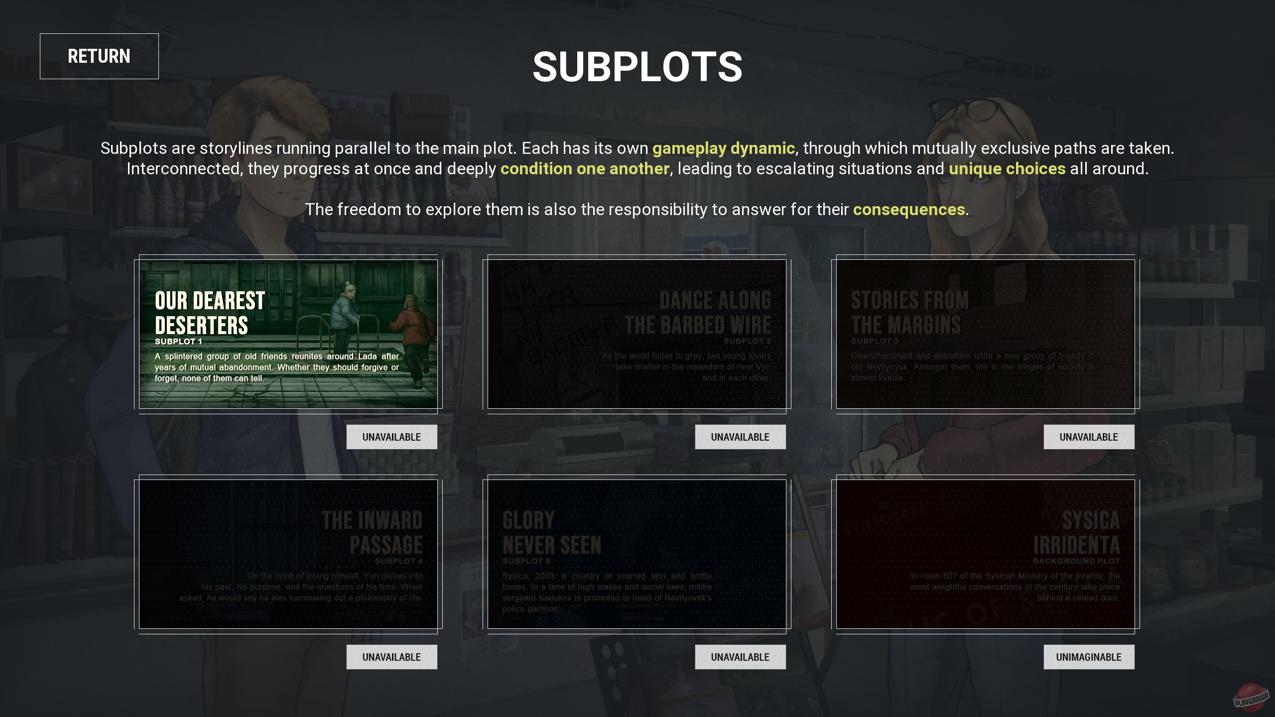 Игроков ждет более десяти уникальных персонажей, огромное количество локаций и неумолимый ход времени, из-за чего герою постоянно приходится делать нелегкий выбор. Игра предлагает к ознакомлению шесть проработанных сюжетных линий, отходящих от основного сюжета а также возможность повлиять на финал истории, свернув во время прохождения на ту или иную дорогу.
