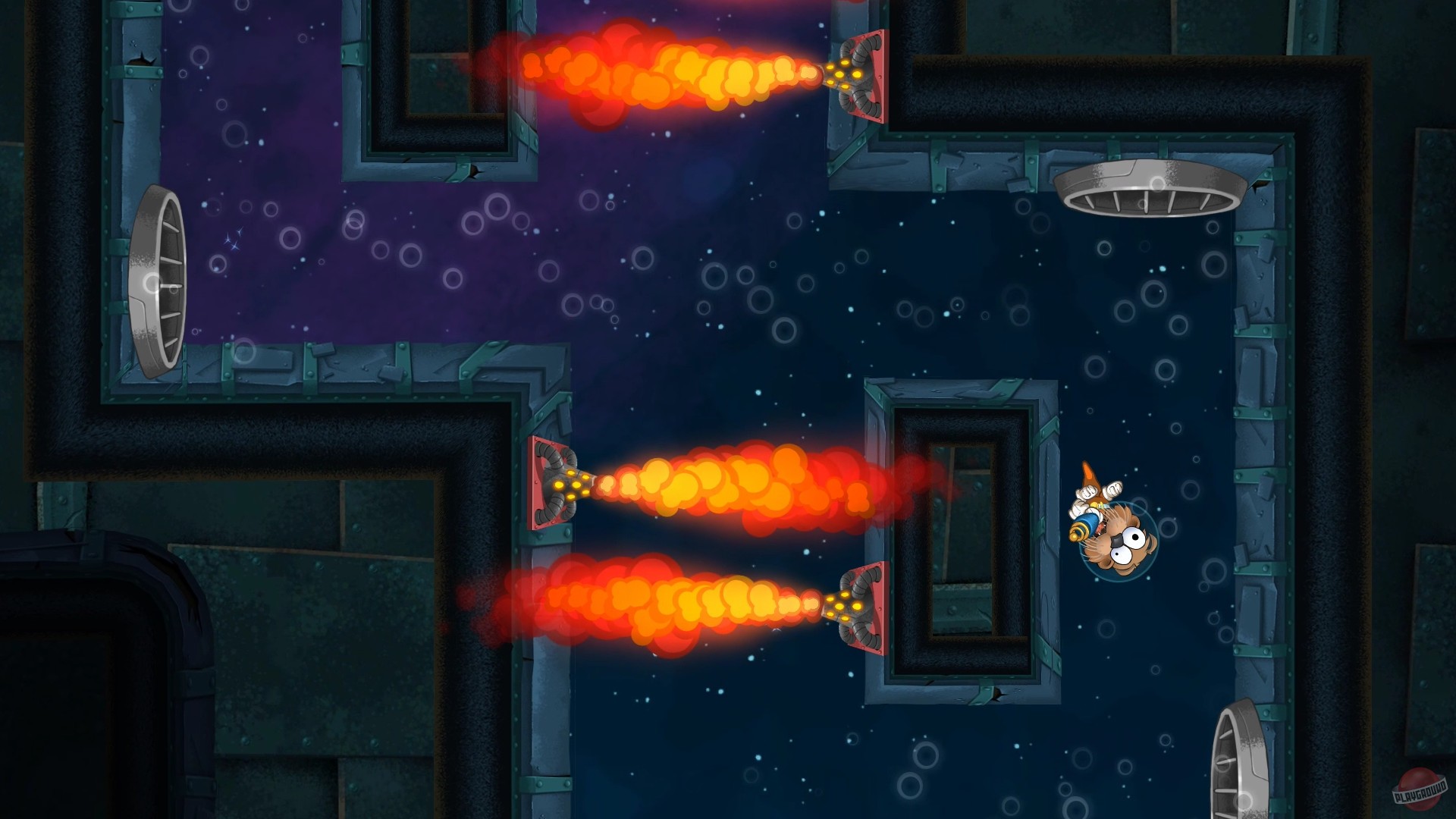 В Space Otter Charlie вас ждёт не просто беготня по платформам, а настоящий квест в условиях невесомости! Вам предстоит исследовать разнообразные планеты и космические станции, решать хитроумные головоломки (иногда с помощью специального ружья-отражателя), собирать ресурсы для крафта и сражаться с целой армией врагов — от роботов и призраков до инопланетных защитных систем. Управление выполнено в стиле "single-stick shooter", что добавляет динамики и уникальности каждому бою, происходящему буквально во всех 360 градусах вокруг вас. А ещё Чарли может нарядиться в импровизированный костюм акулы из пены! Ну разве это не вершина космической моды? Игра предлагает элементы псевдо-Metroidvania: по мере прохождения вы получаете новые способности, которые открывают доступ к ранее недоступным зонам, превращая каждый новый виток исследования в маленькую победу.