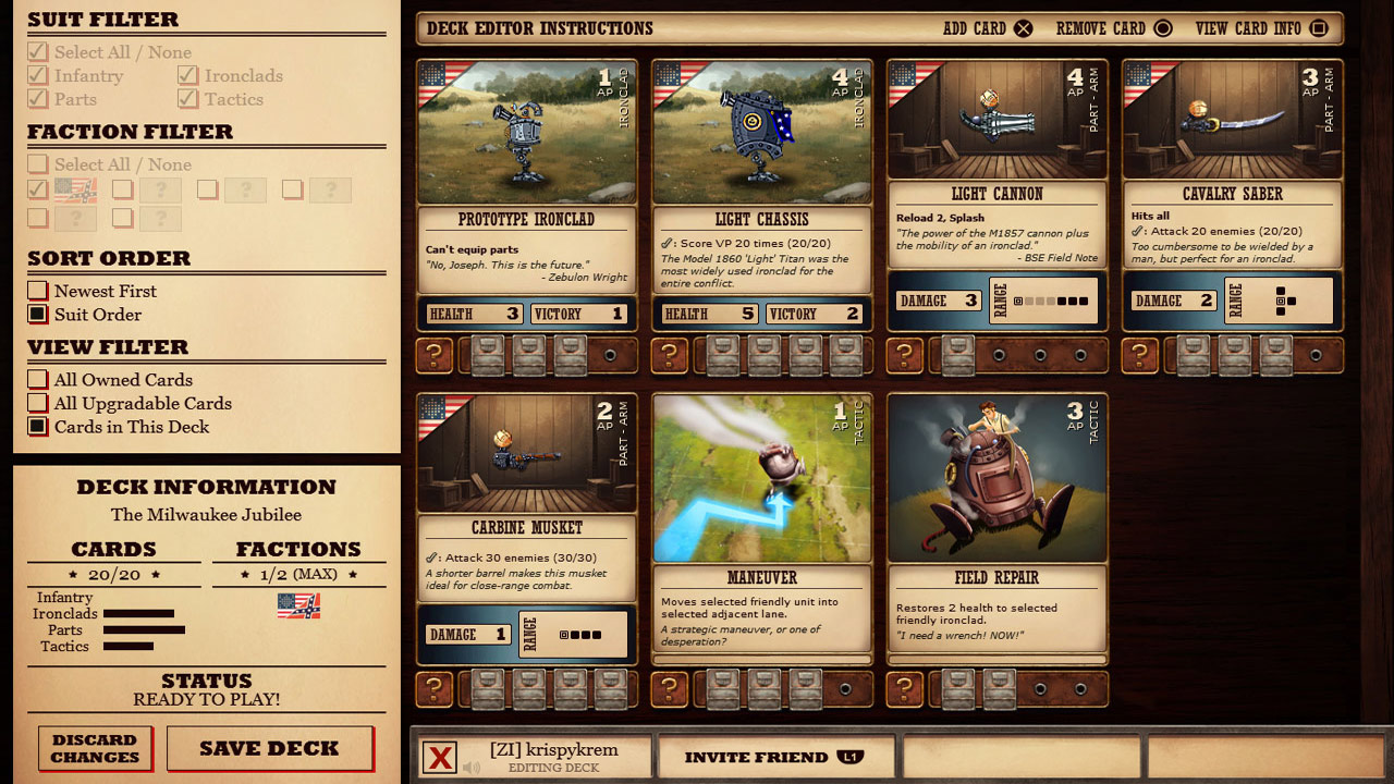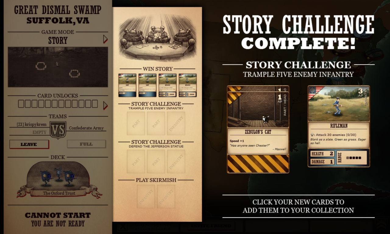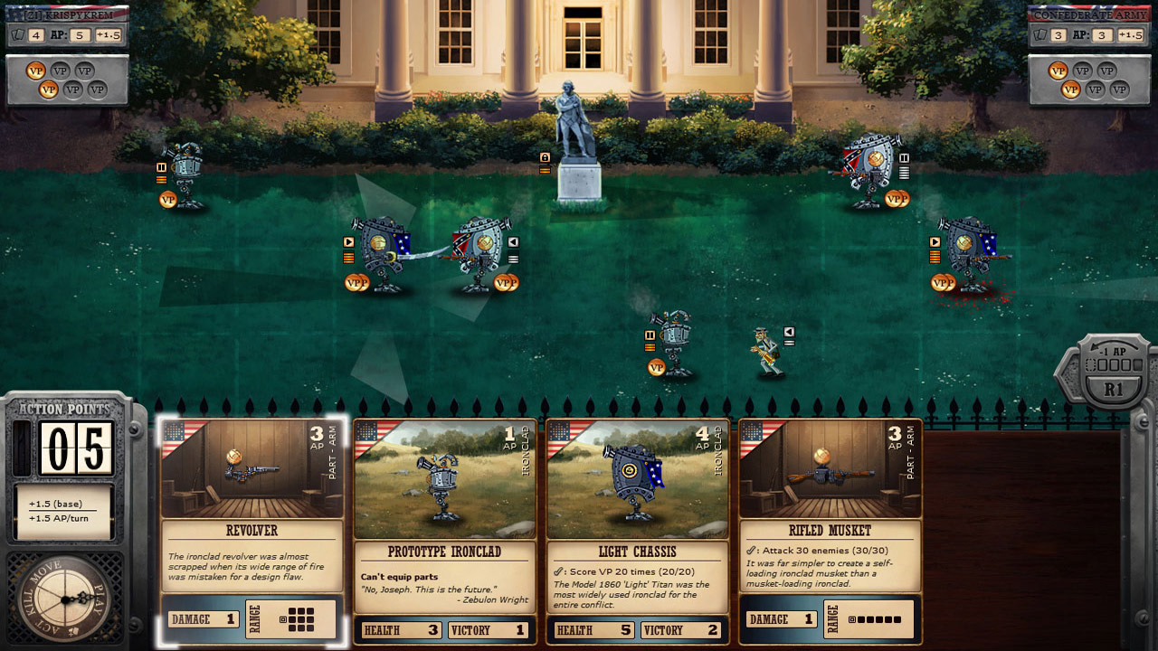 Добро пожаловать в Ironclad Tactics — место, где Гражданская война в США проходит не так, как в школьных учебниках! Забудьте о скучных лекциях по истории: здесь северяне и южане отложили в сторону мушкеты и взялись за гаечные ключи, чтобы собрать армии из паровых роботов-«броненосцев». Представьте себе, если бы Тесла и Эдисон вместо споров о токе устроили настоящий робо-апокалипсис на полях сражений XIX века. Именно в этот безумный, но удивительно логичный альтернативный мир вас приглашает эта уникальная карточная стратегия. Это не просто игра, это ваш шанс переписать историю, вооружив генерала Ли механической рукой-дробилкой!