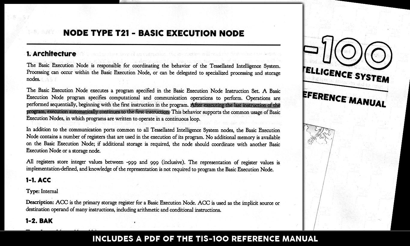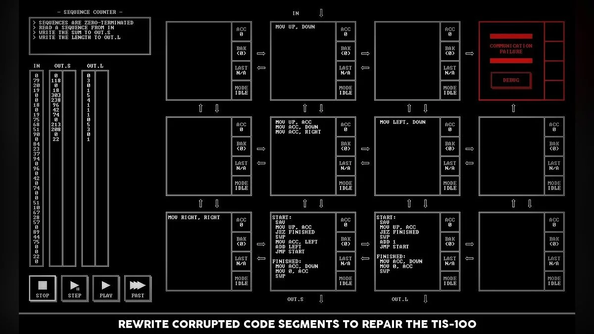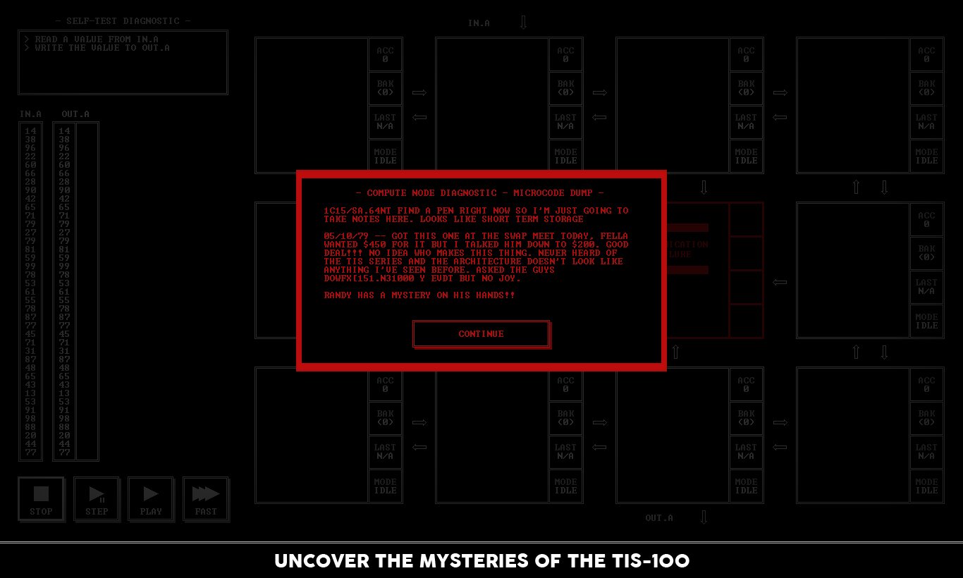 Забыли, как выглядит настоящий вызов? Устали от игр, где достаточно просто нажать на кнопку "Атака"? Тогда TIS-100 — это ваш шанс вернуться в строй, вооружившись не мечом, а знаниями (или хотя бы упрямством)! От создателей культовой головоломки SpaceChem, студии Zachtronics, приходит эта уникальная игра-головоломка, которая с первого взгляда кажется безобидной таблицей с кучей окошек, а на деле превращается в самый изощрённый тренажёр для вашего мозга. Ваша задача — не спасти принцессу и даже не разрушить злодейскую базу, а восстановить повреждённые фрагменты кода в загадочном компьютере TIS-100, используя упрощённый язык ассемблера. Да-да, вы не ослышались: это одна из самых необычных игр про программирование, где вместо монстров вас ждут регистры, команды MOV и JRO, а вместо эпичных кат-сцен — лаконичный терминал 80-х.