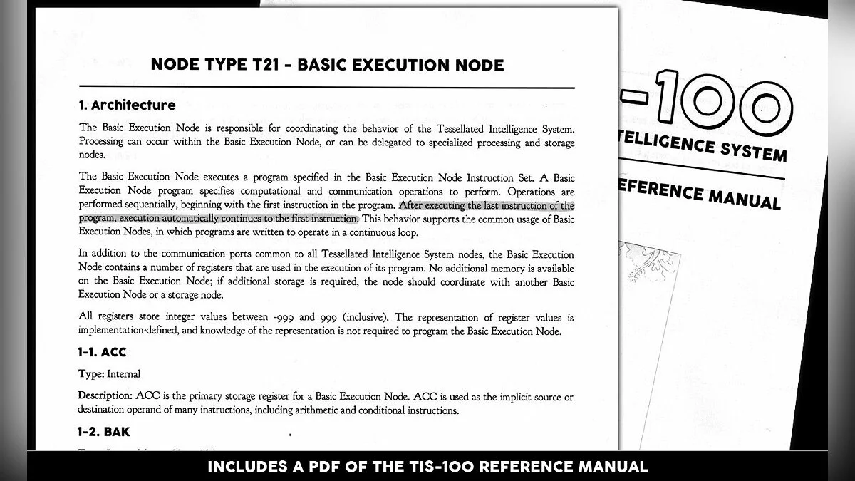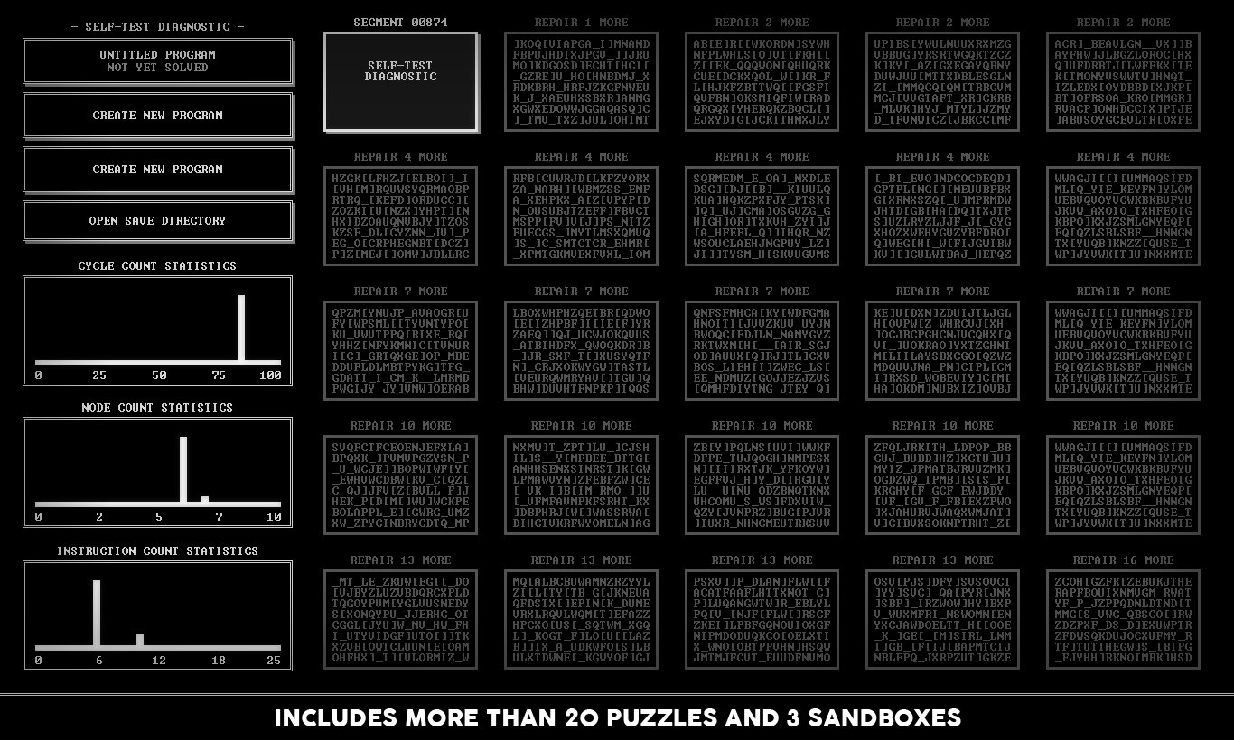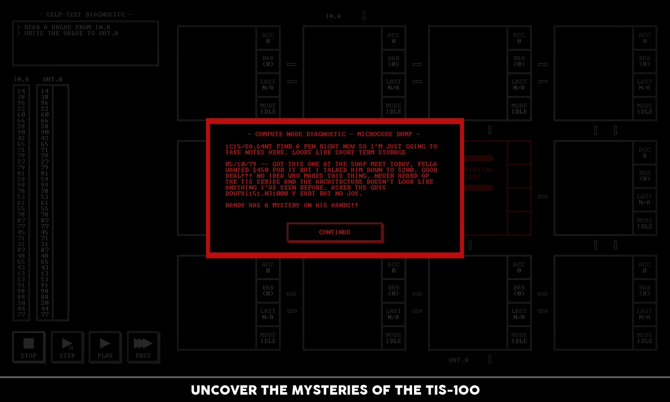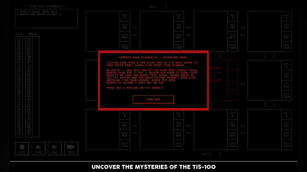 Забыли, как выглядит настоящий вызов? Устали от игр, где достаточно просто нажать на кнопку "Атака"? Тогда TIS-100 — это ваш шанс вернуться в строй, вооружившись не мечом, а знаниями (или хотя бы упрямством)! От создателей культовой головоломки SpaceChem, студии Zachtronics, приходит эта уникальная игра-головоломка, которая с первого взгляда кажется безобидной таблицей с кучей окошек, а на деле превращается в самый изощрённый тренажёр для вашего мозга. Ваша задача — не спасти принцессу и даже не разрушить злодейскую базу, а восстановить повреждённые фрагменты кода в загадочном компьютере TIS-100, используя упрощённый язык ассемблера. Да-да, вы не ослышались: это одна из самых необычных игр про программирование, где вместо монстров вас ждут регистры, команды MOV и JRO, а вместо эпичных кат-сцен — лаконичный терминал 80-х.