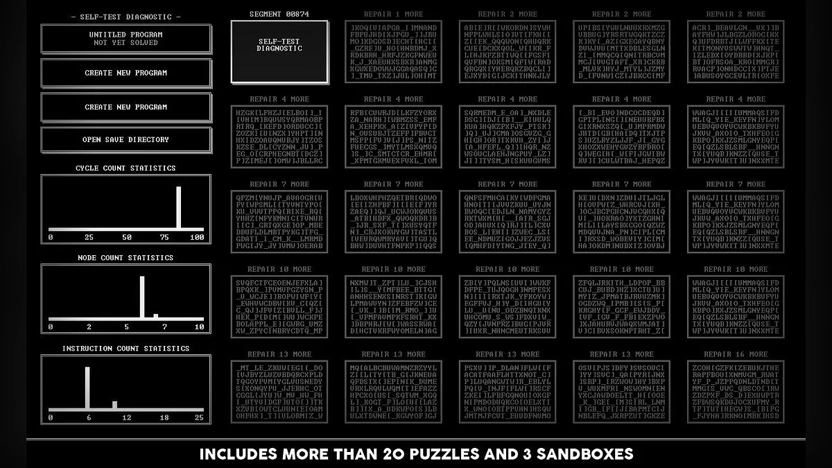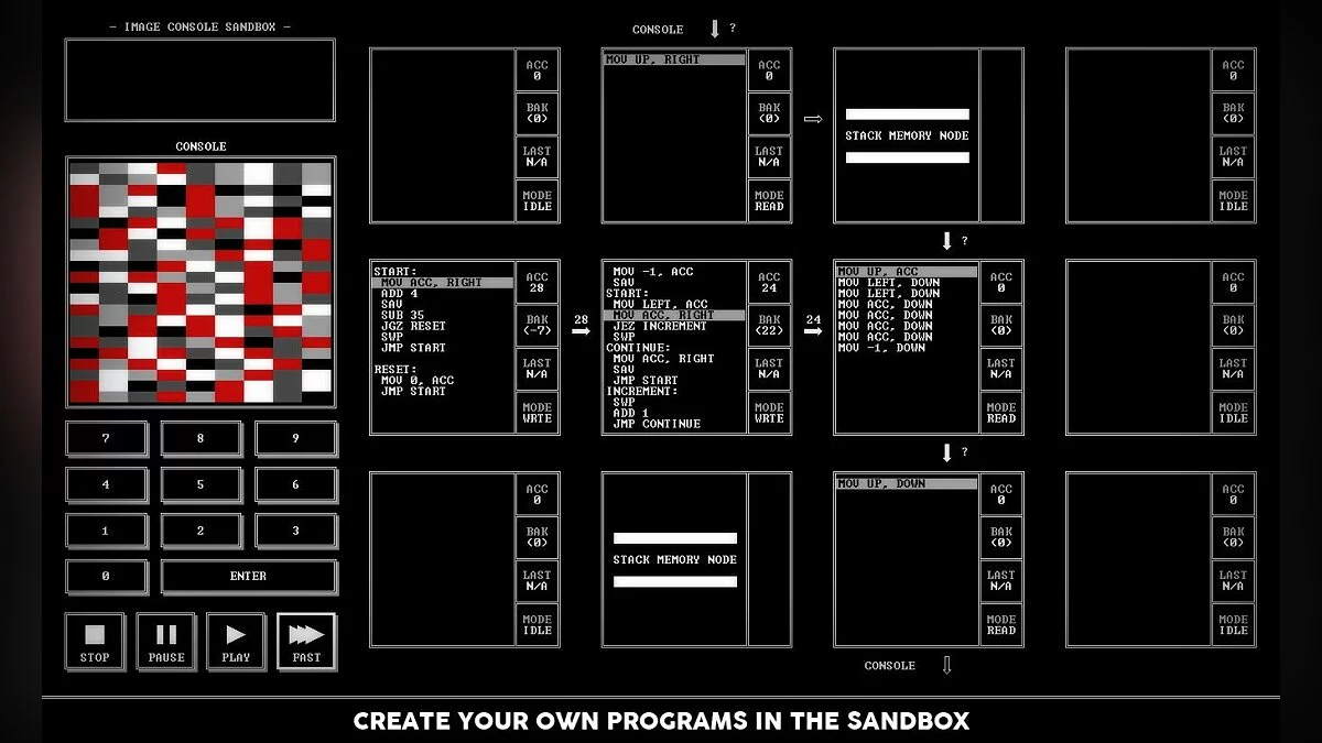 Геймплей TIS-100 построен на чистой логике и параллельных вычислениях. Вы получаете схему из нескольких узлов (nodes), каждый из которых представляет собой мини-процессор со своими ограничениями. Ваша миссия — заставить их работать вместе, чтобы преобразовать входящие данные в нужный вам результат. Это как собрать пазл, но пазл написан на языке, который понимают только самые отчаянные фанаты компьютерной архитектуры. Игра не просто бросает вас в омут с головой — она вежливо протягивает вам 27-страничное руководство пользователя (да, настоящее, как в старых добрых DOS-играх!), которое является вашим главным союзником. Здесь нет подсказок от NPC или волшебных решений; есть только вы, ваша смекалка и бесконечное желание оптимизировать свой код, чтобы занять место в таблице лидеров. Это идеальная игра для тех, кто любит сложные логические головоломки и хочет понять, как на самом деле "думают" компьютеры.
